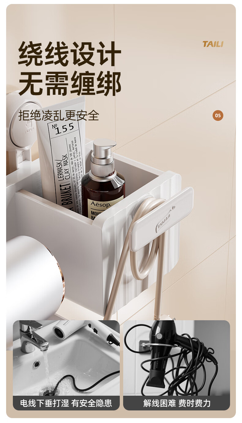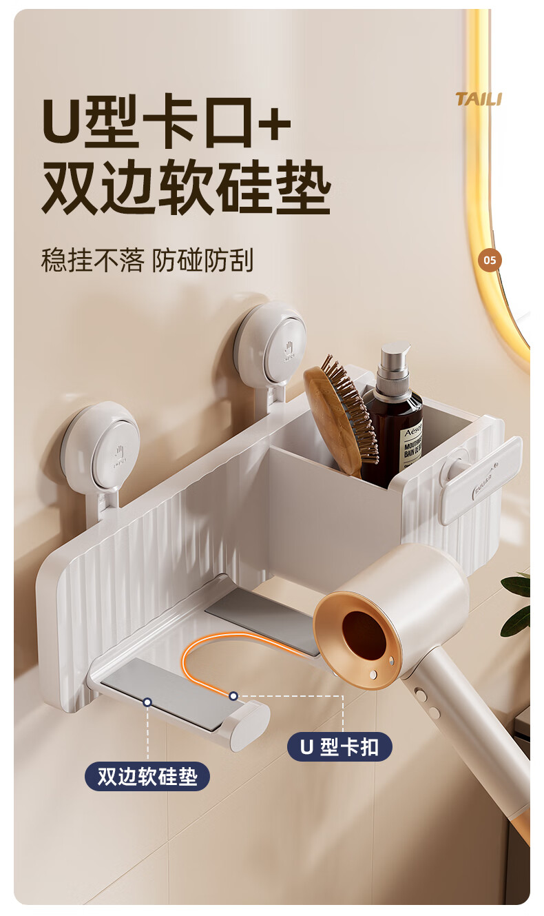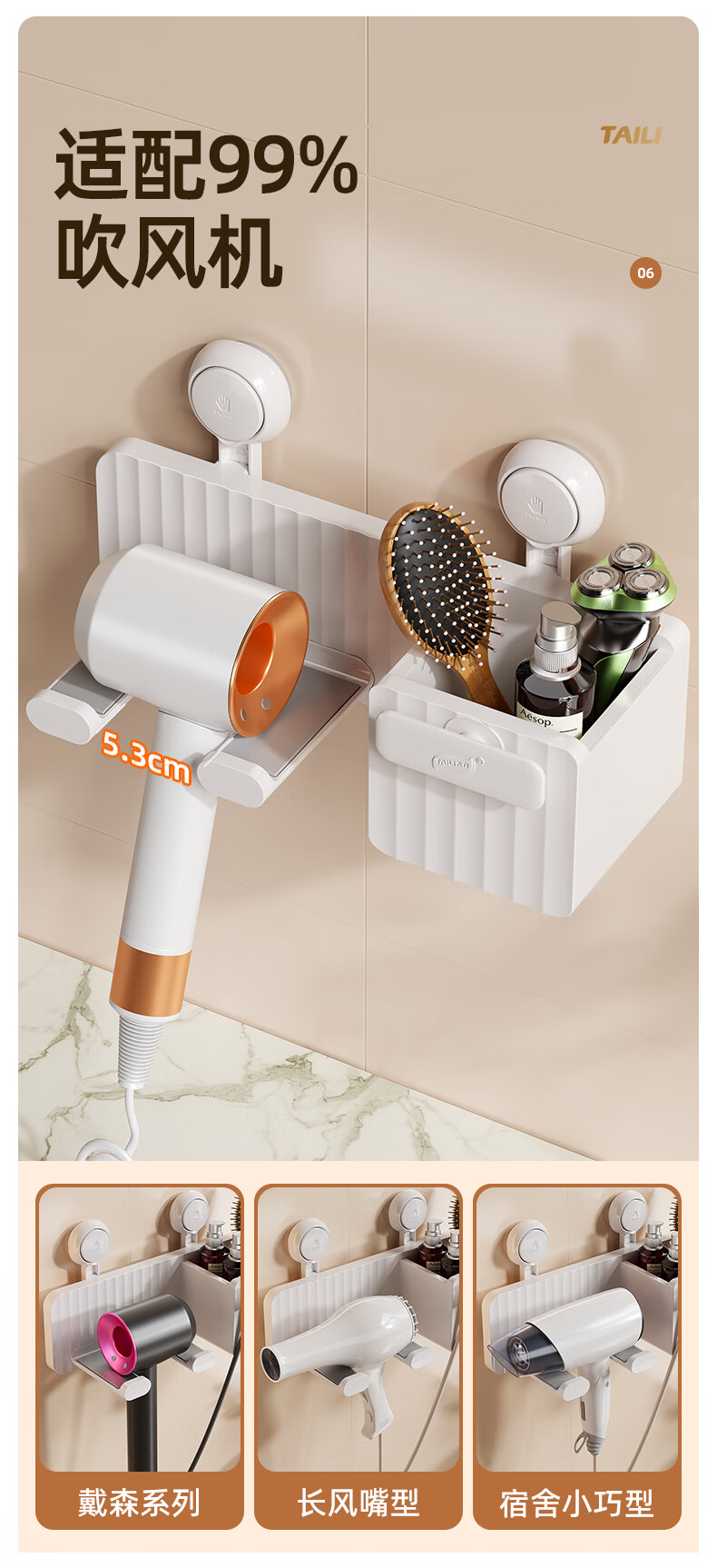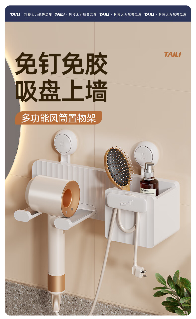 太力免打孔卫生间吹风机置物架浴室壁挂支架洗漱台挂架徕芬戴森通用 奶油白吸盘风筒架【带收纳筒】