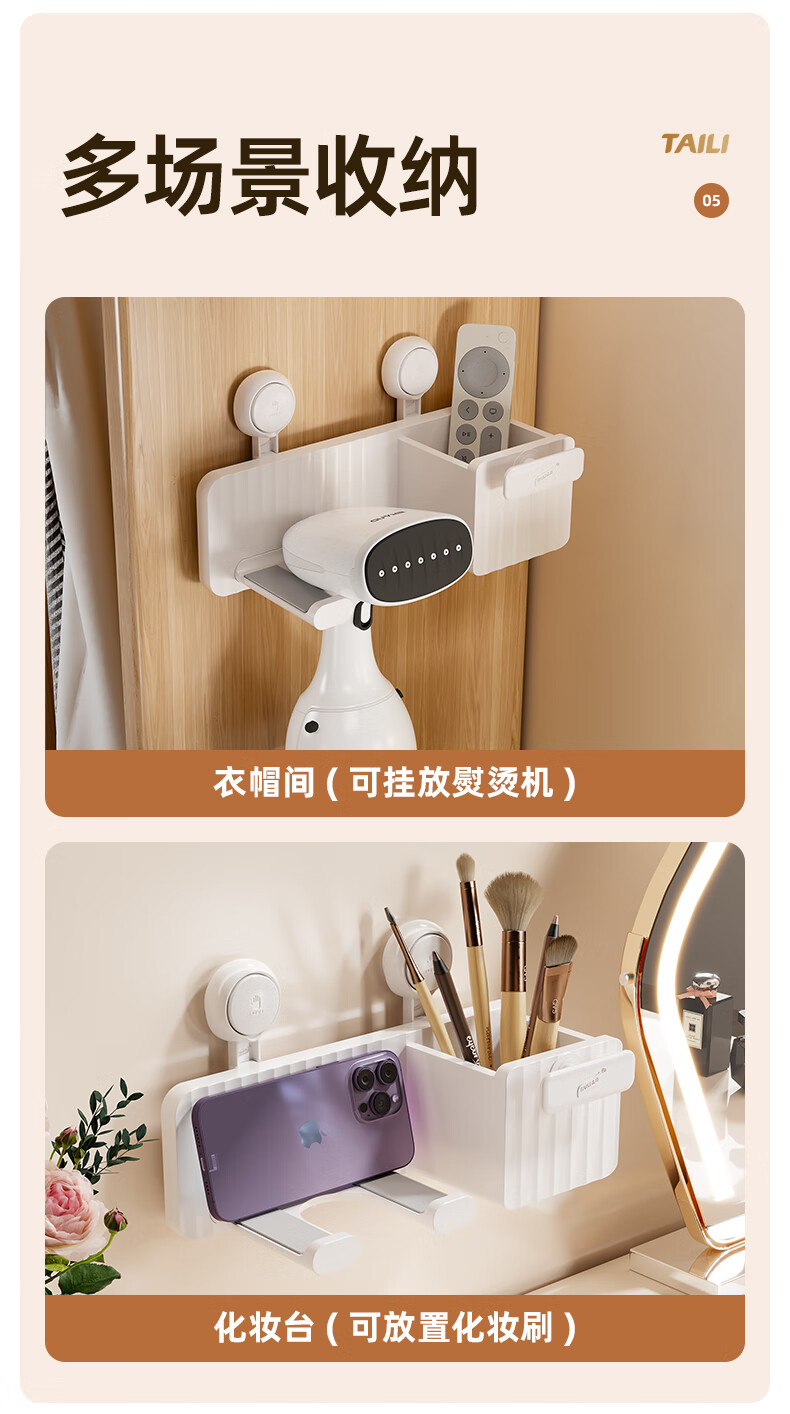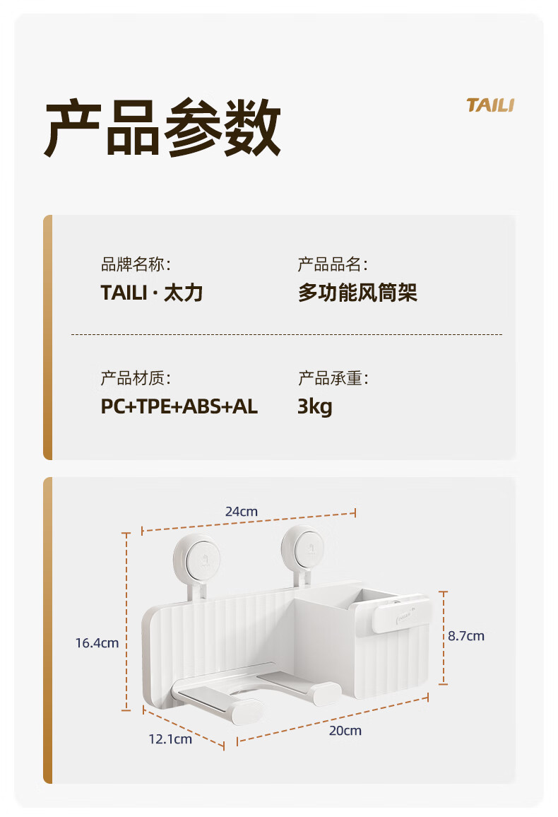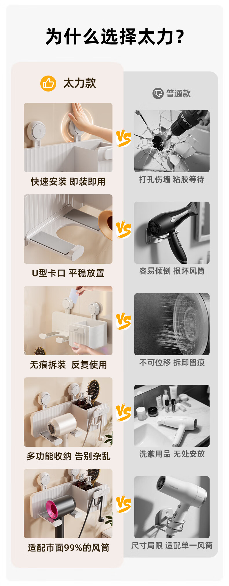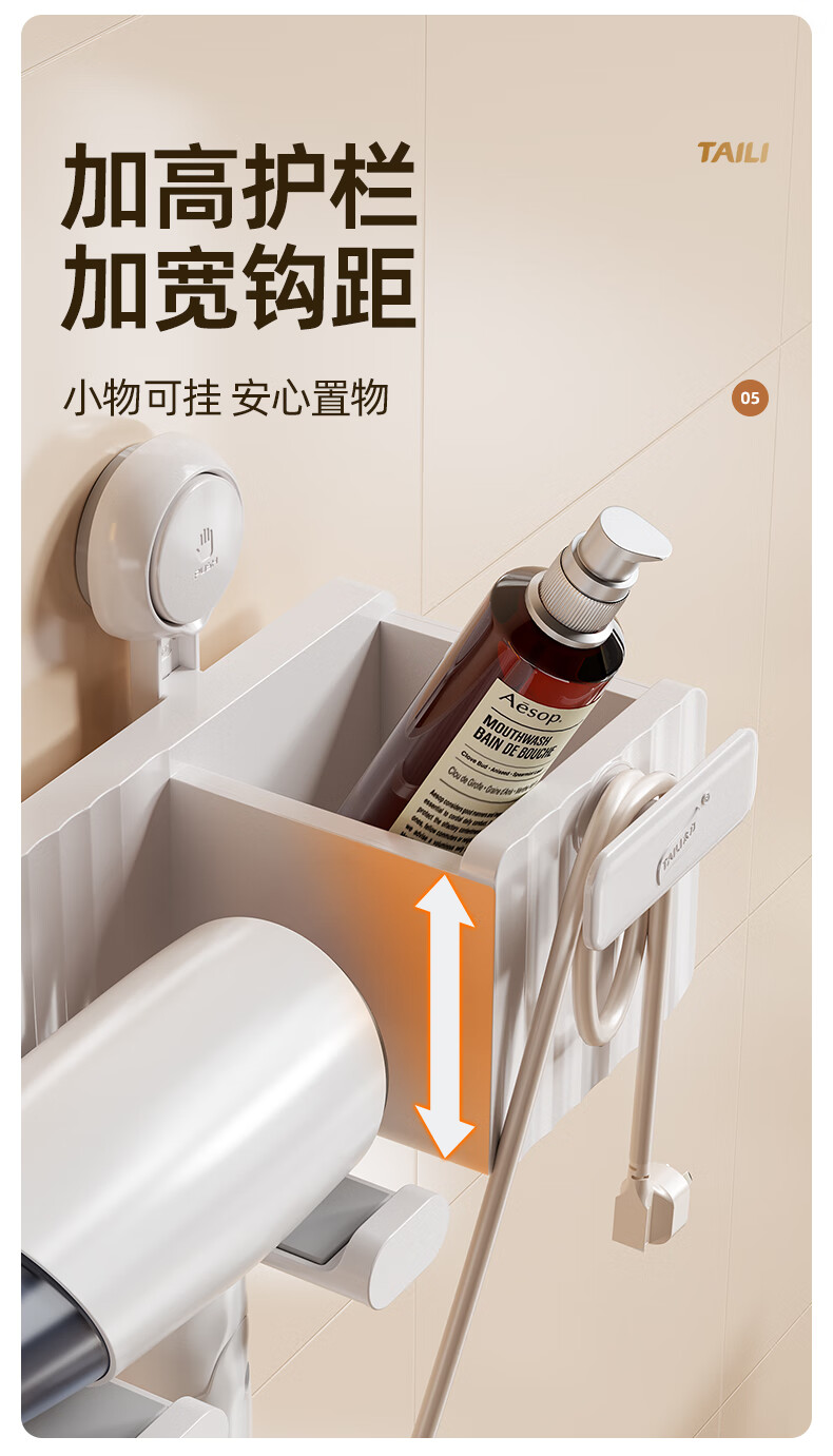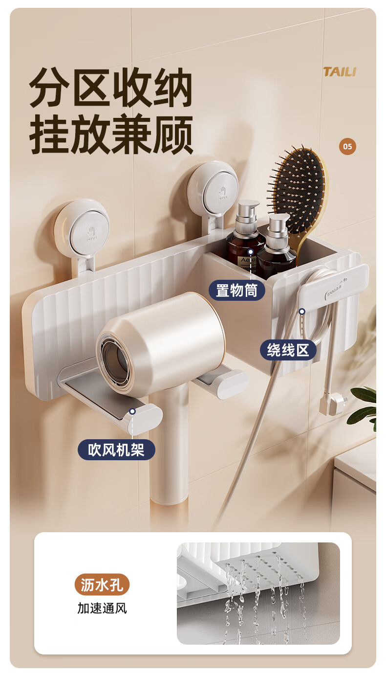 太力免打孔卫生间吹风机置物架浴室壁挂支架洗漱台挂架徕芬戴森通用 奶油白吸盘风筒架【带收纳筒】