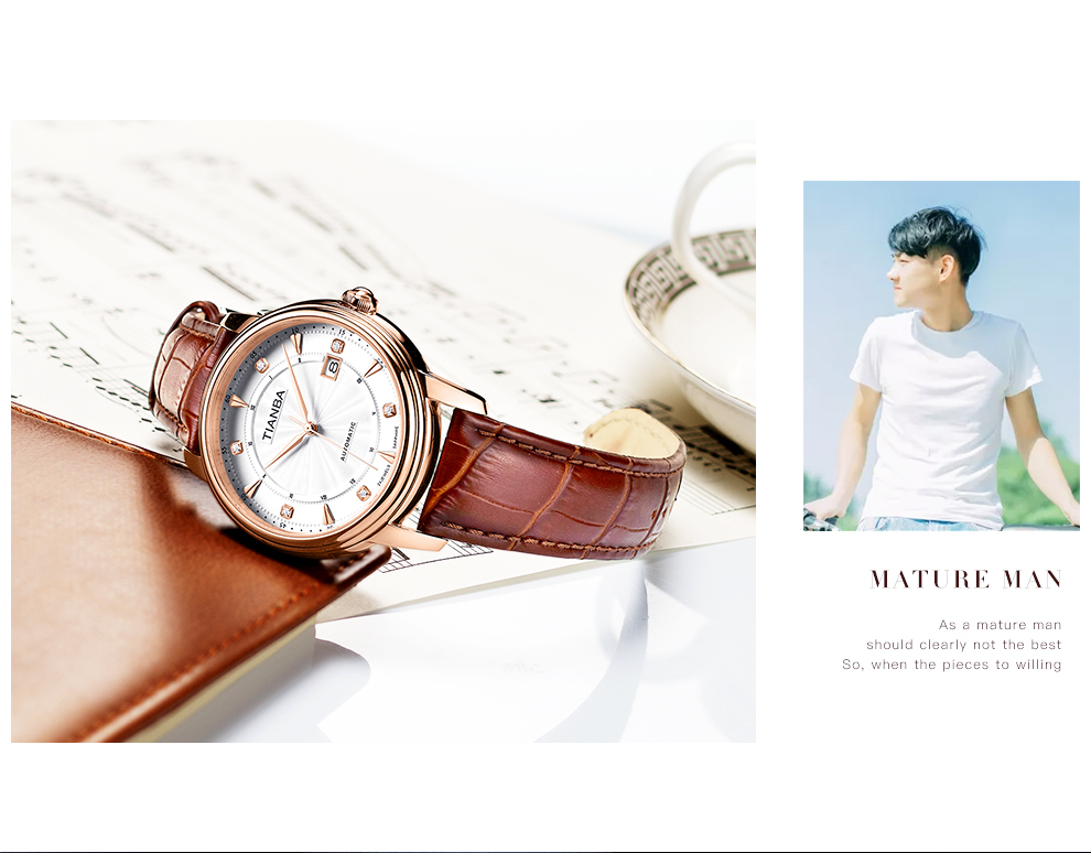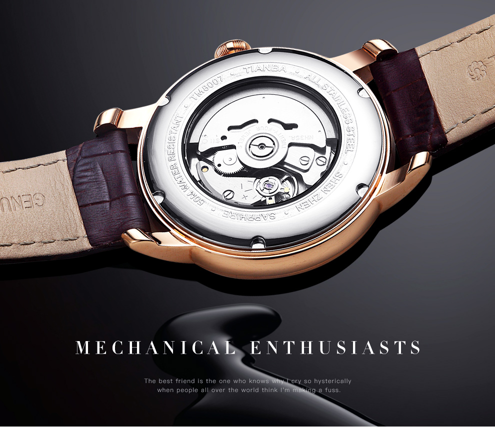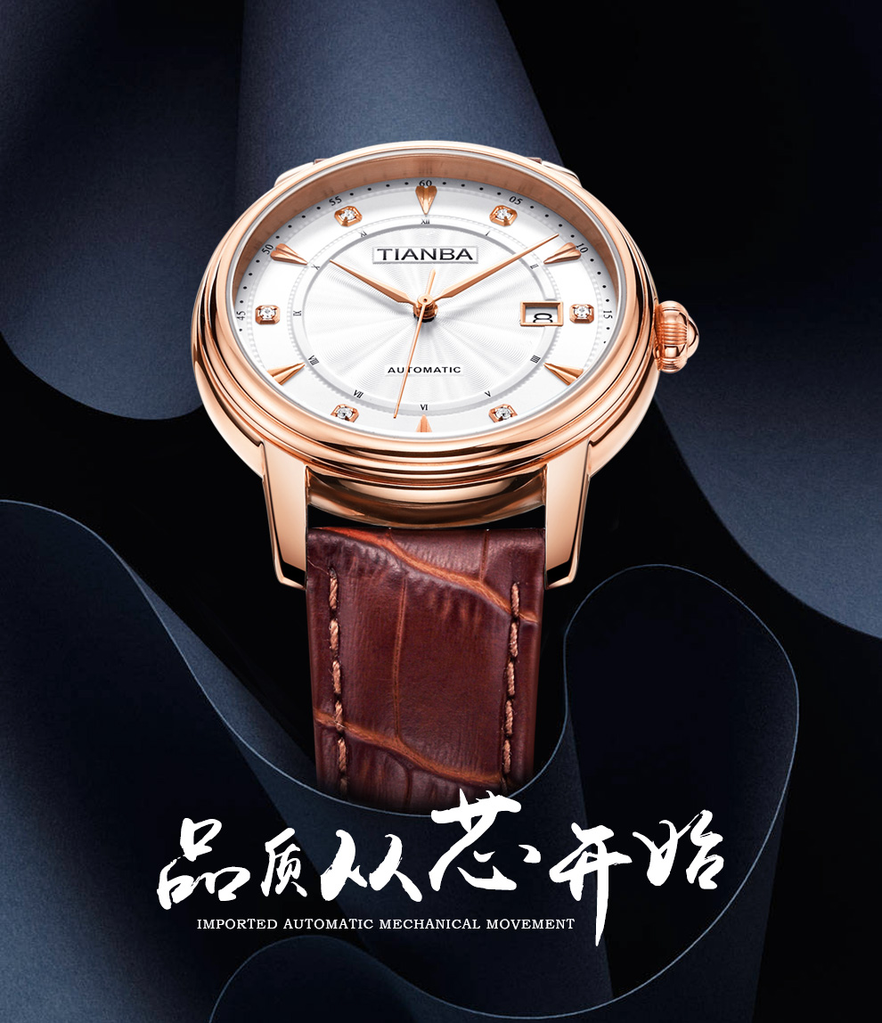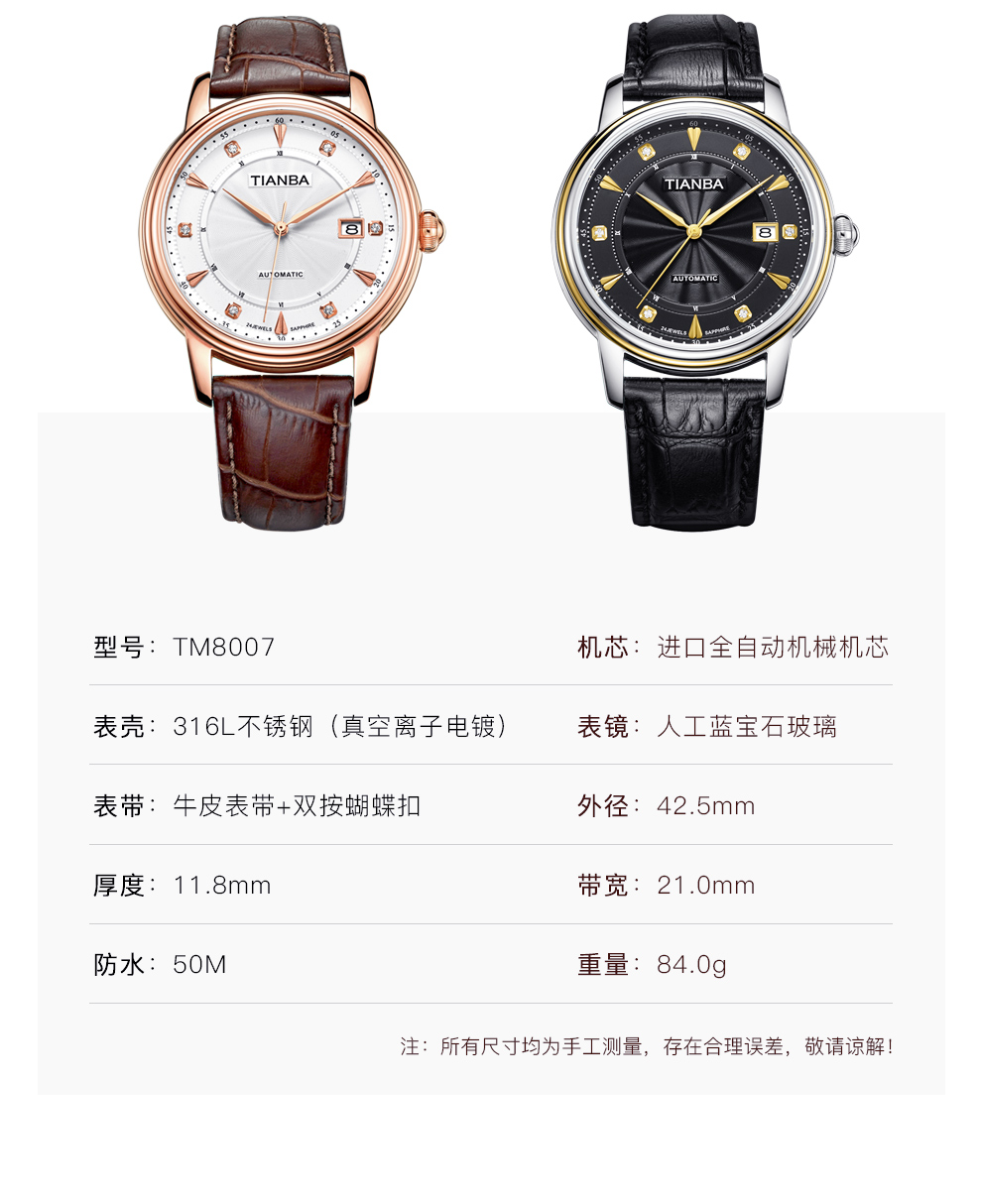 天霸(TIANBA)手表男士时尚休闲腕表真皮表带日历镶钻男表全自动机械男表TM8007 黑色 TM8007.01PK