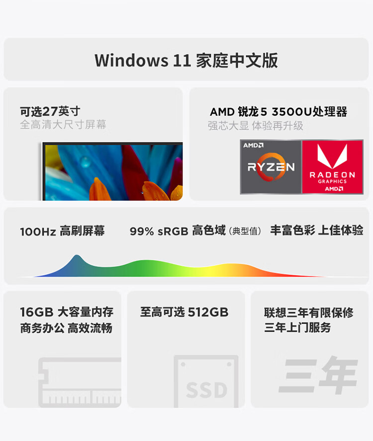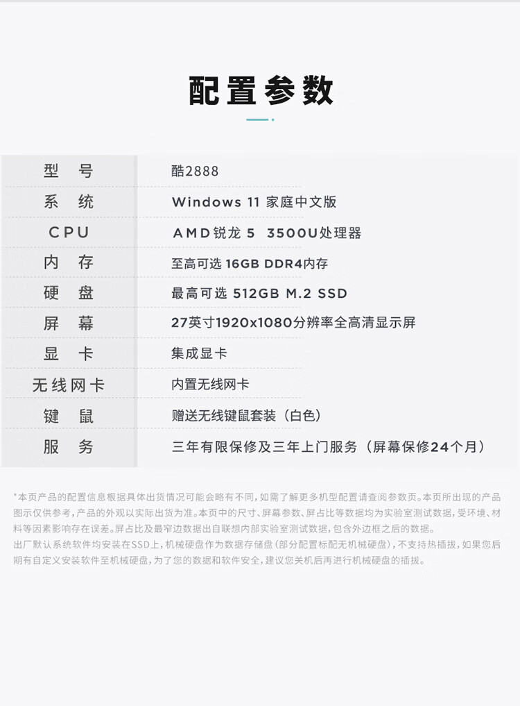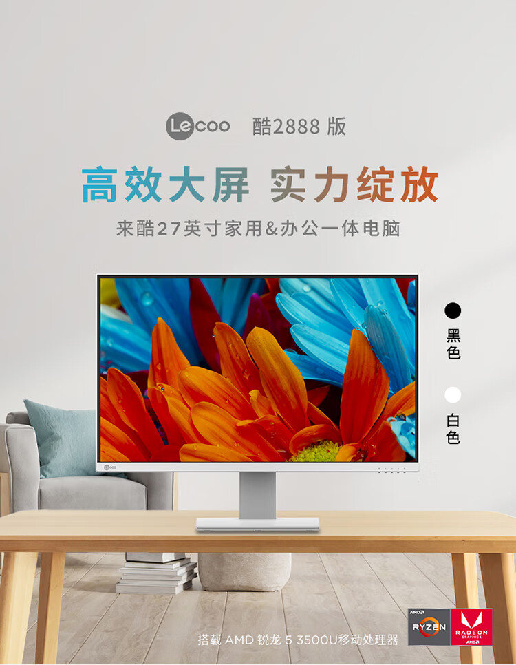 联想(Lenovo)来酷 Lecoo一体台式机电脑27英寸(R5-3500U 16G内存 512GB SSD 无线键鼠 正版win11系统 ) 黑