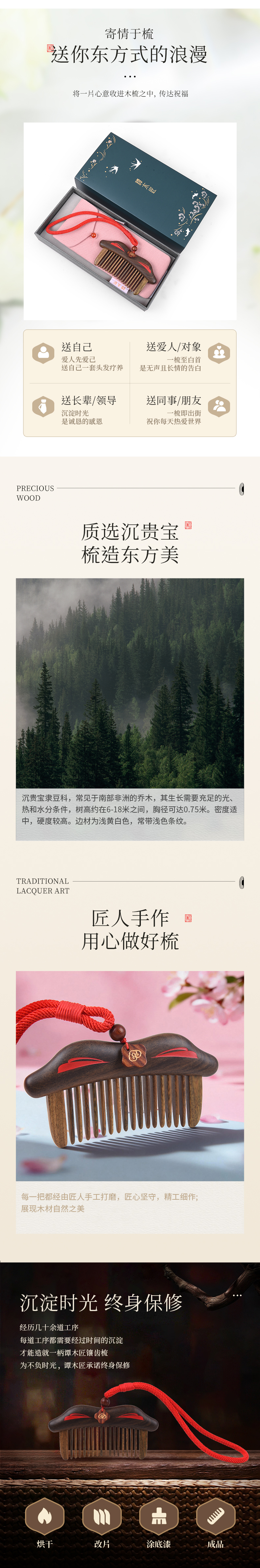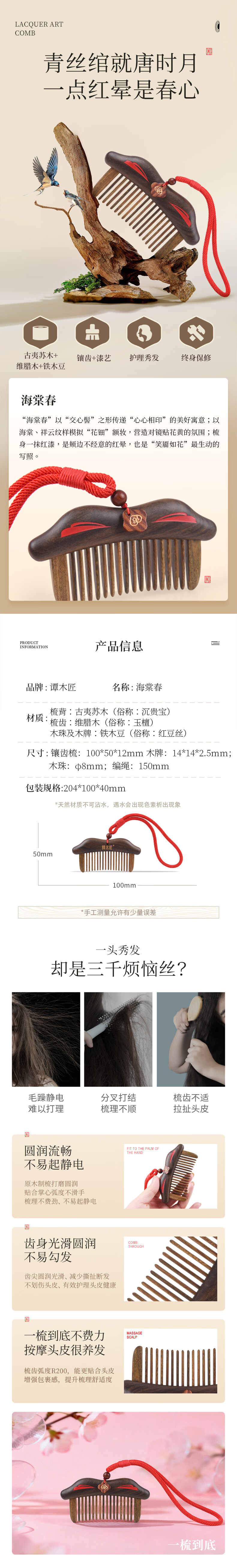 谭木匠经络梳系列作品海棠春镶齿梳礼盒居家日用馈赠亲友礼物实木按摩
