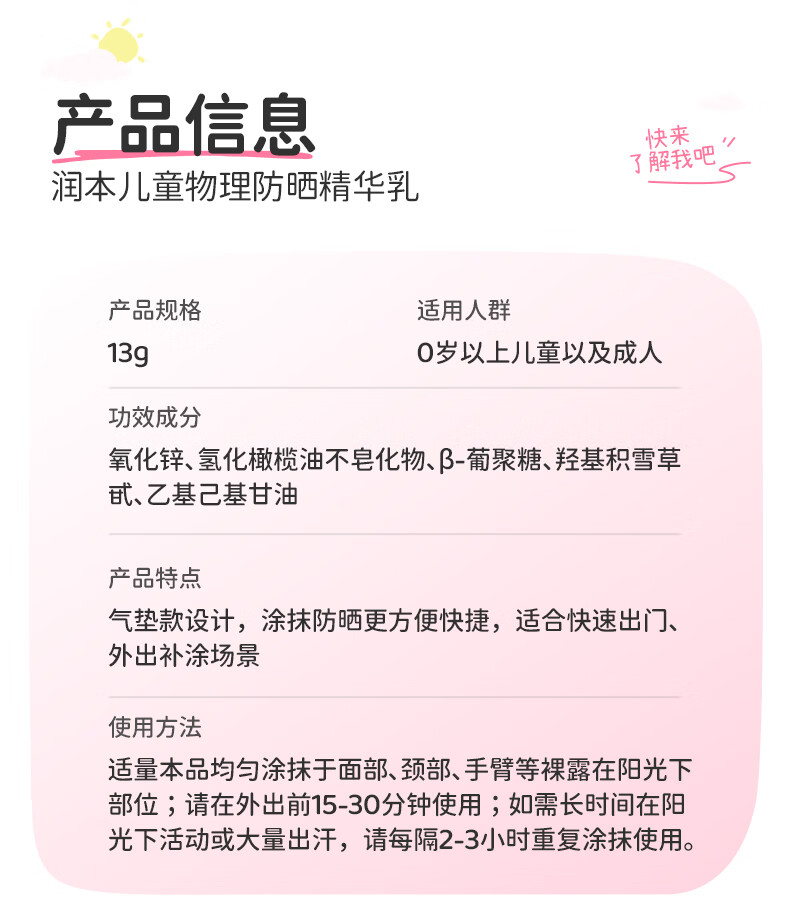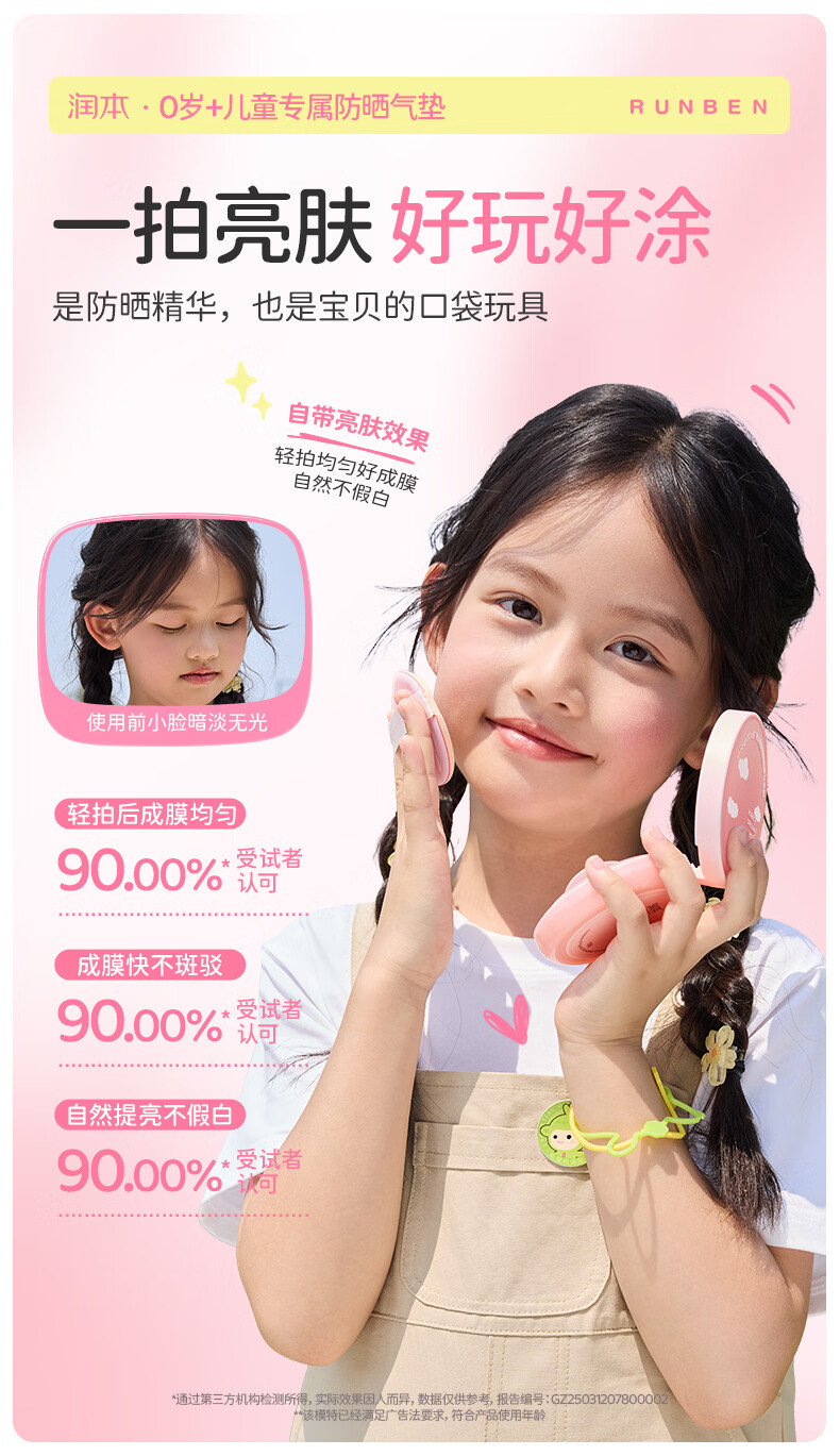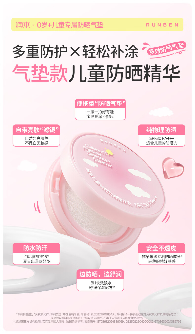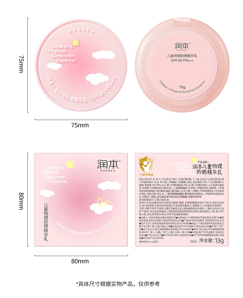润本儿童物理防晒精华乳防水防汗亮肤防晒气垫13g户外便携防晒SPF30