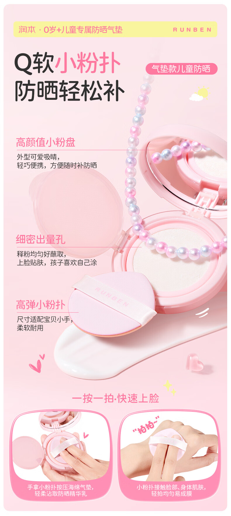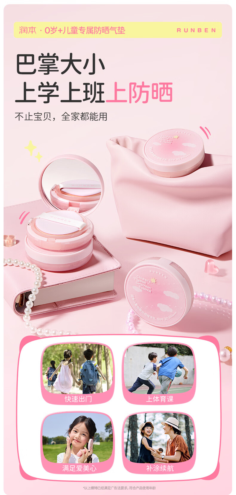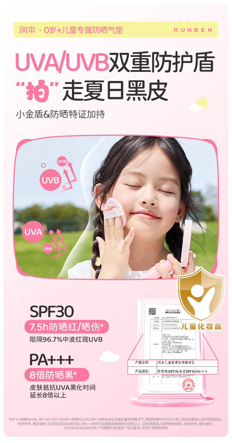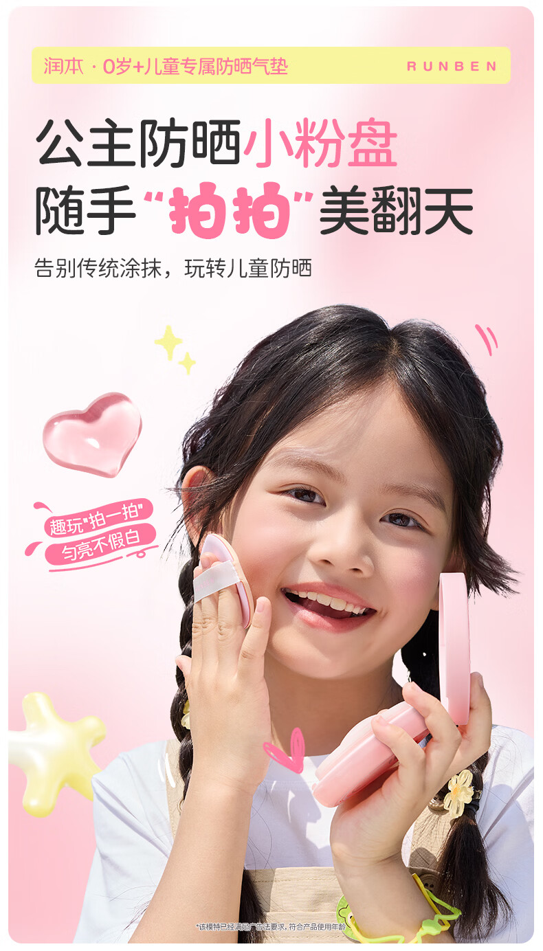 润本儿童物理防晒精华乳防水防汗亮肤防晒气垫13g户外便携防晒SPF30