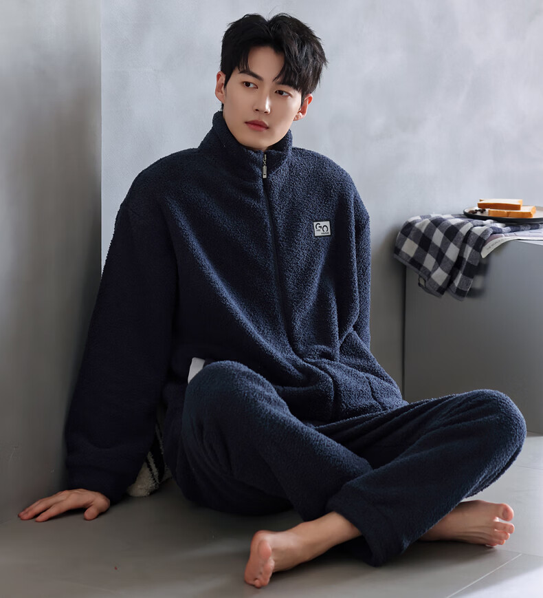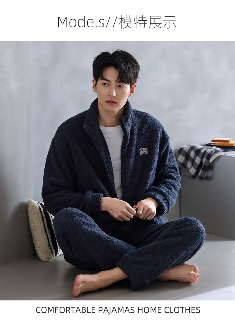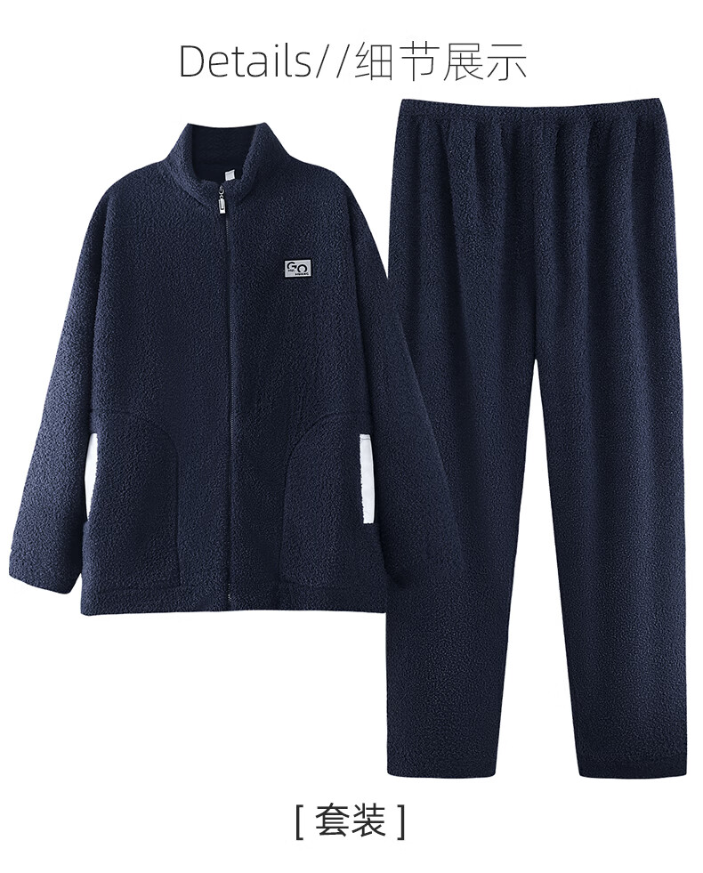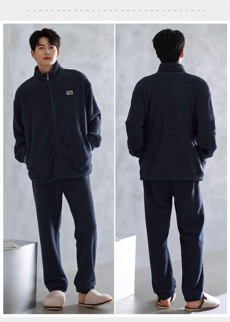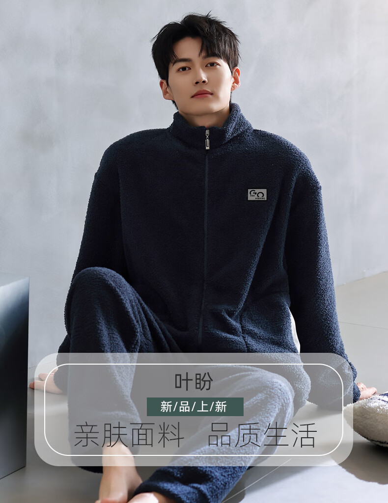 叶盼(yepan)【保暖】羊羔绒睡衣男冬季宽松大码高级感冬天加绒加厚家居服套装 9061-氨蓝 M (165) :建议100-120斤穿着