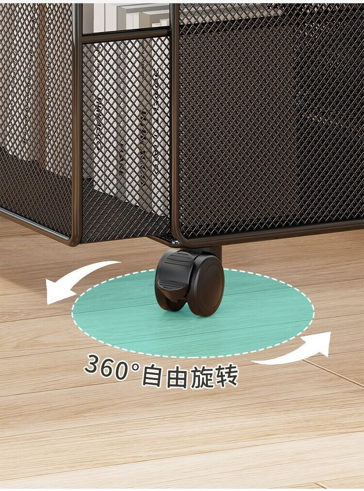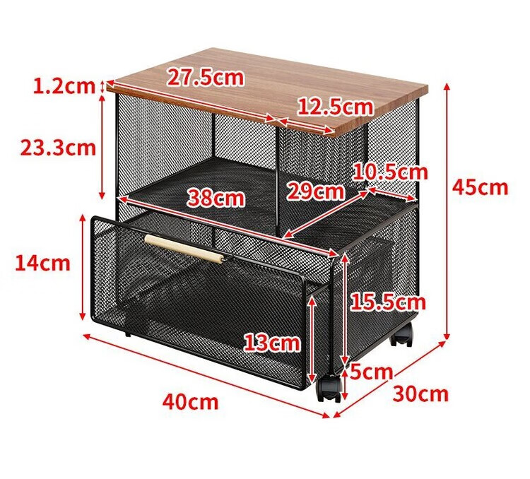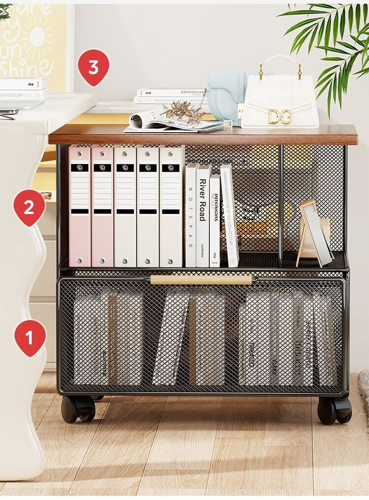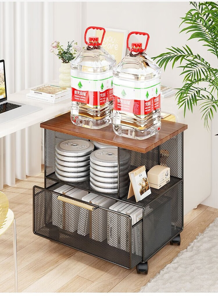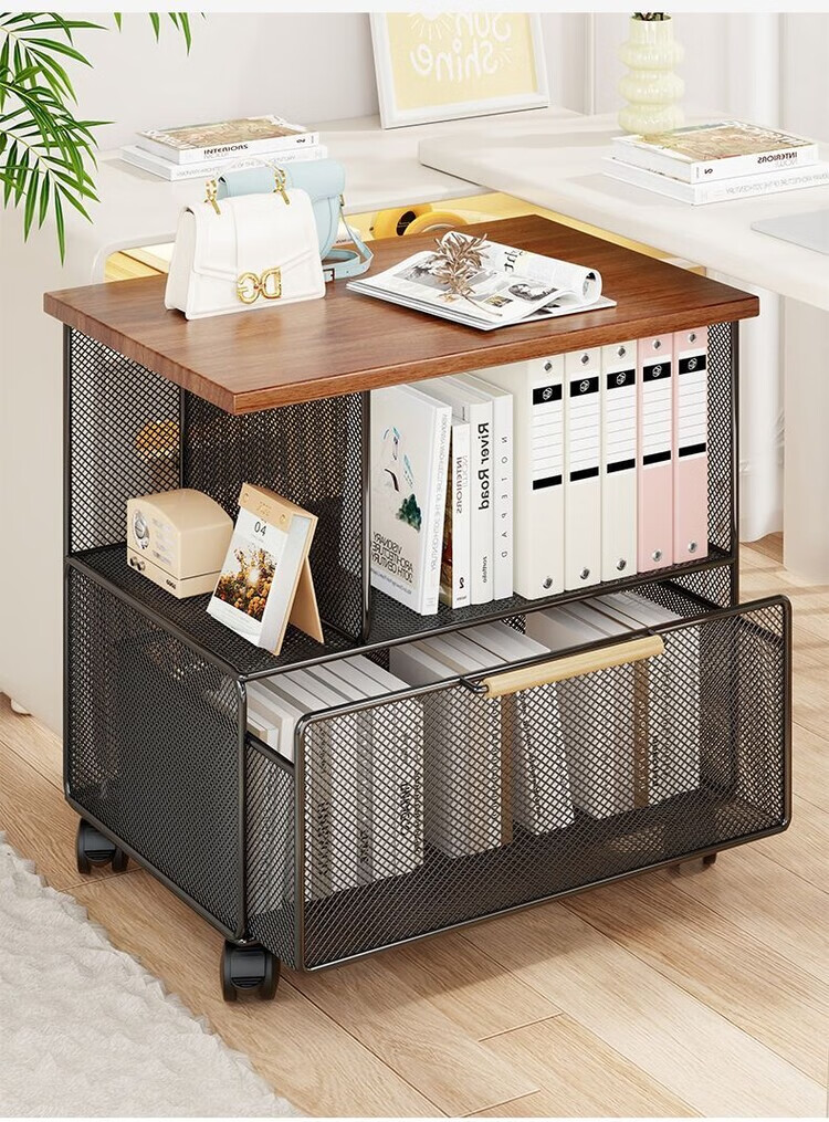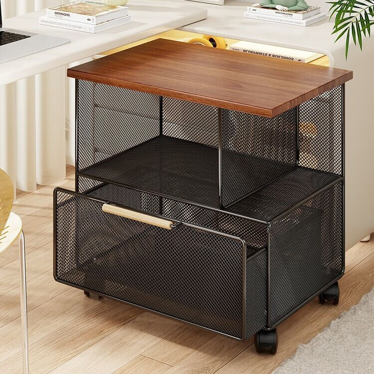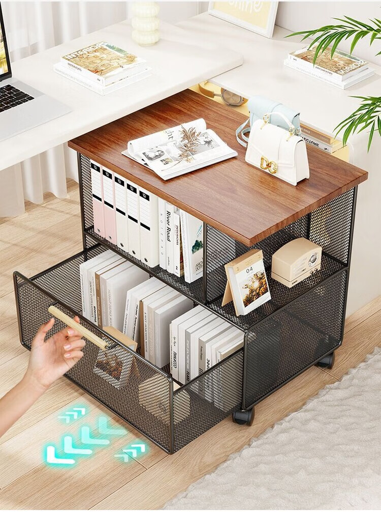海诗圣堡桌下可移动资料收纳柜落地文件整理抽屉式带轮小推车办公室置物架 黑架柚木板