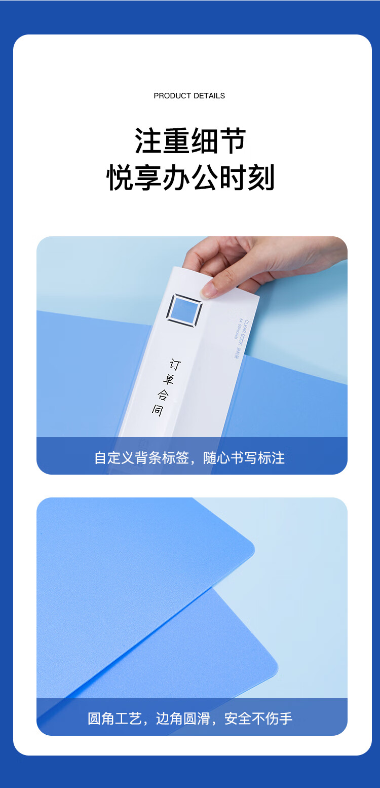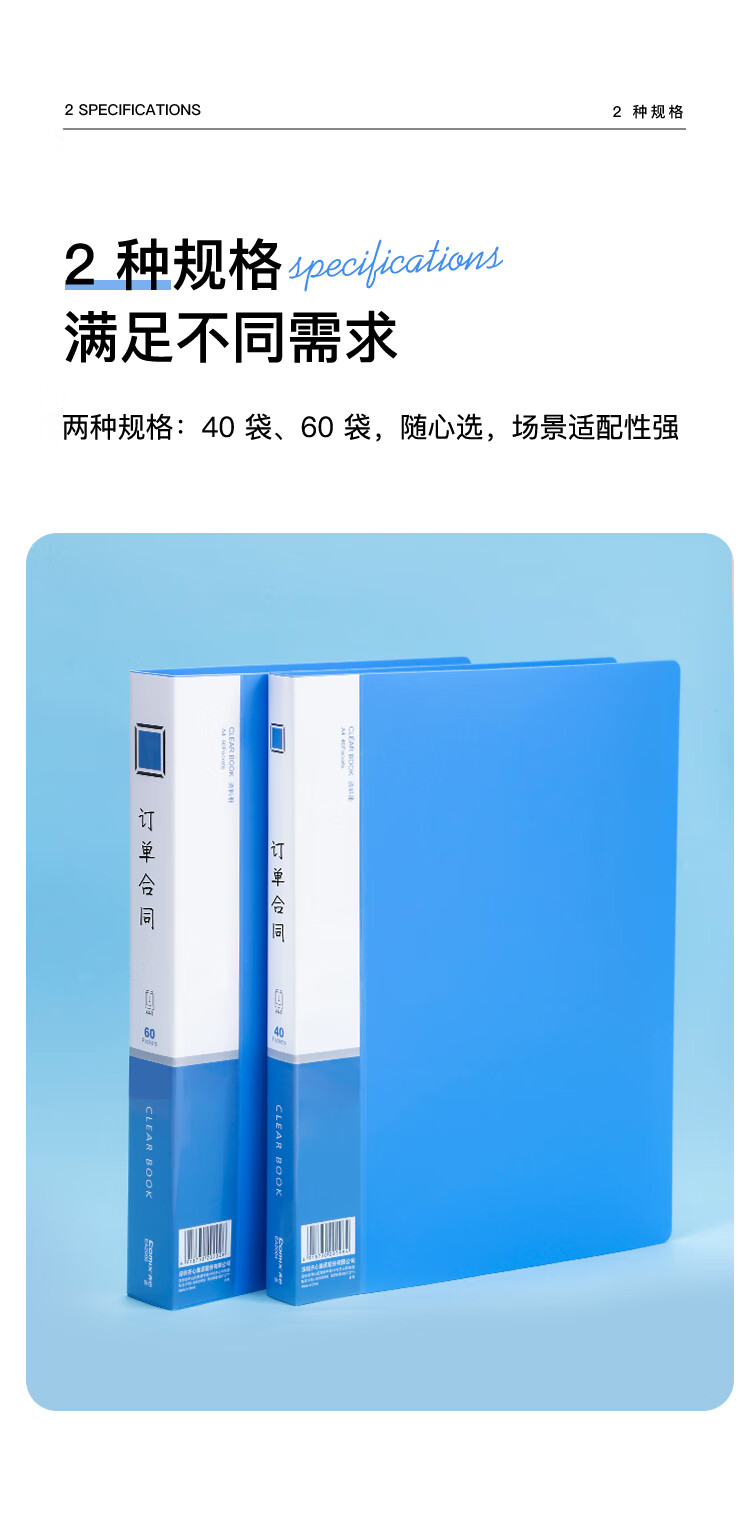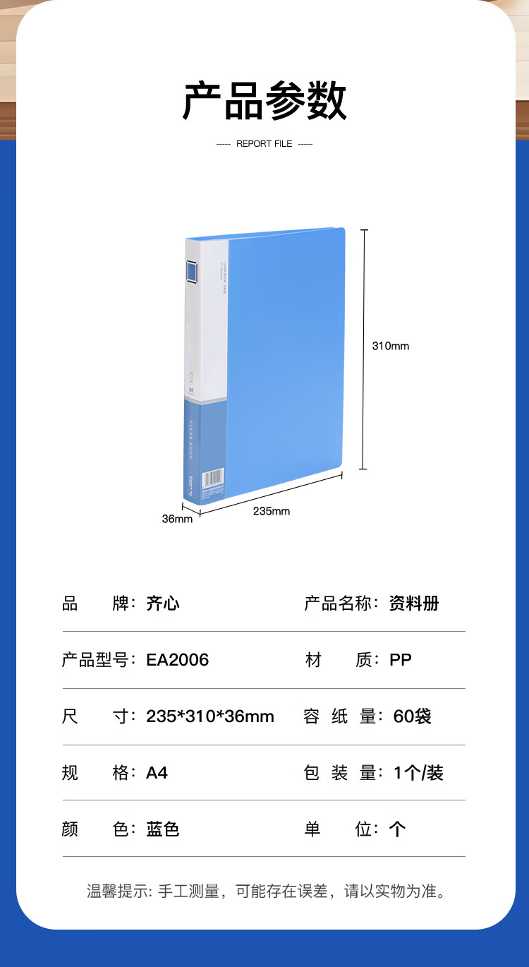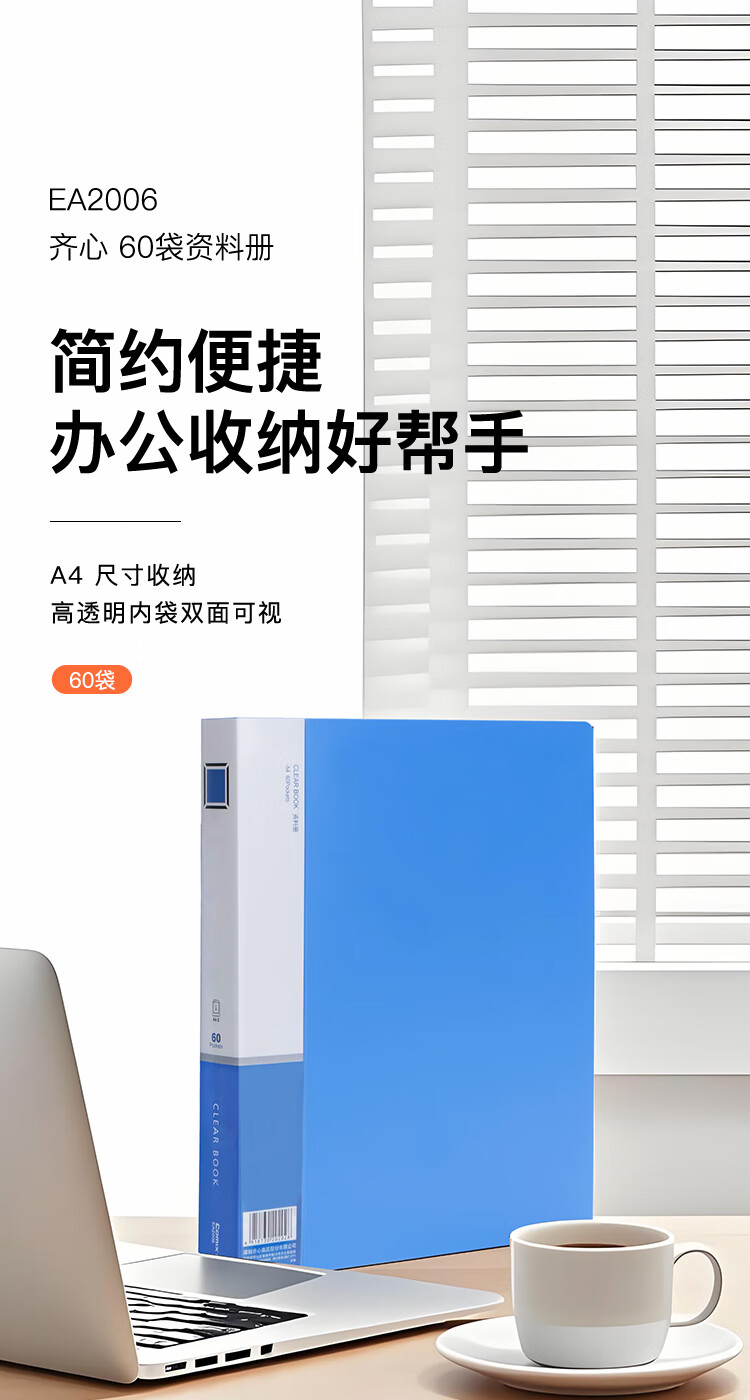 齐心(COMIX)A4/60页资料册文件夹插页袋文件册活页夹档案学生试卷科目收纳袋发票管理办公文件保护蓝色EA2006