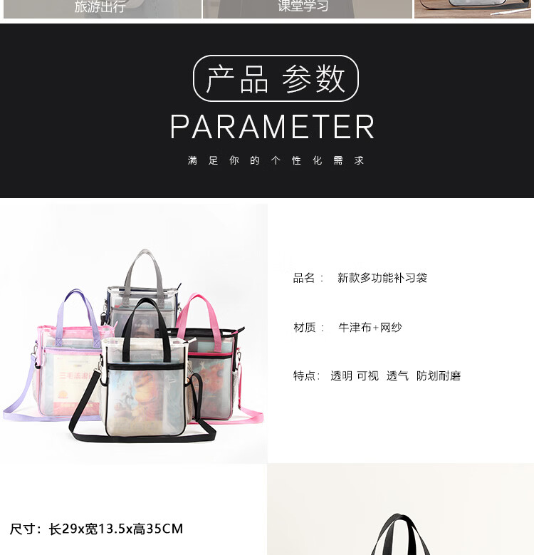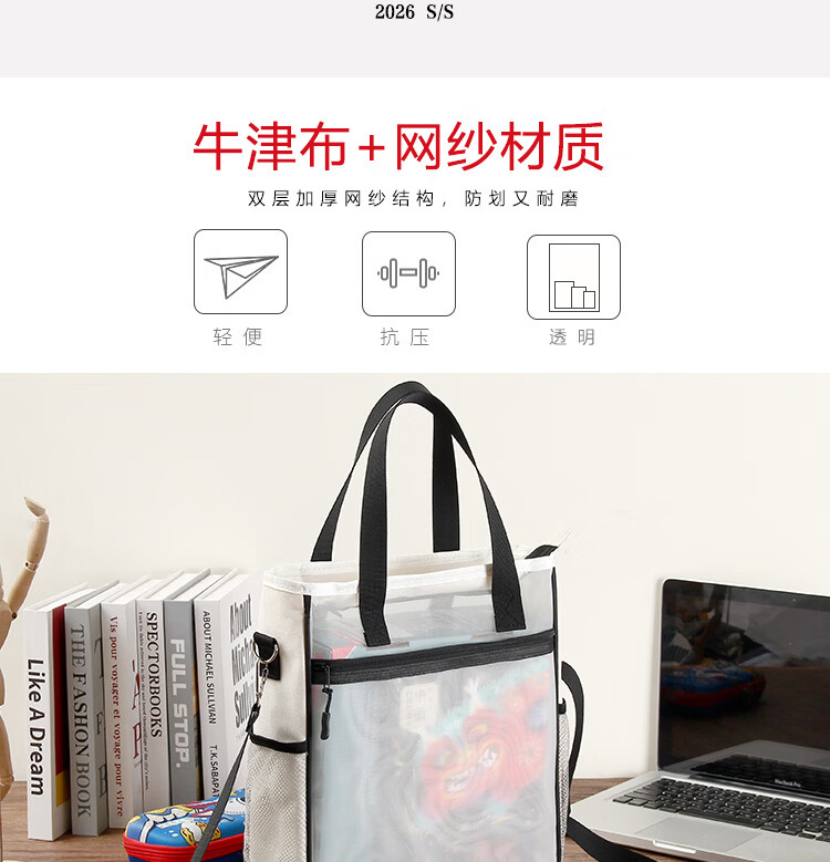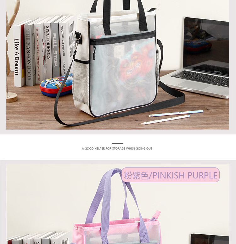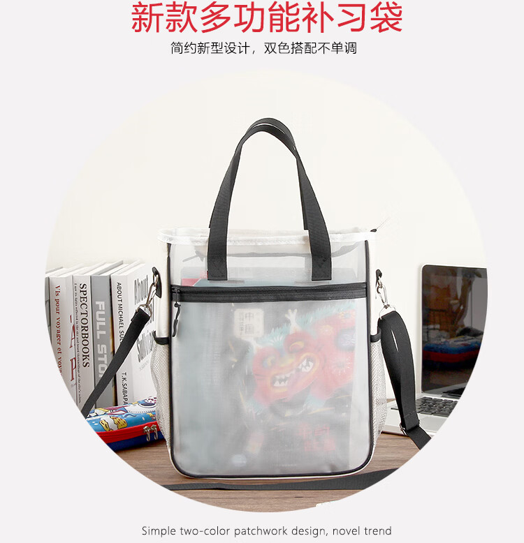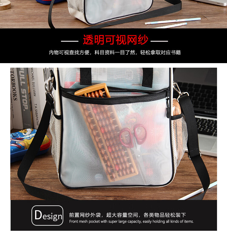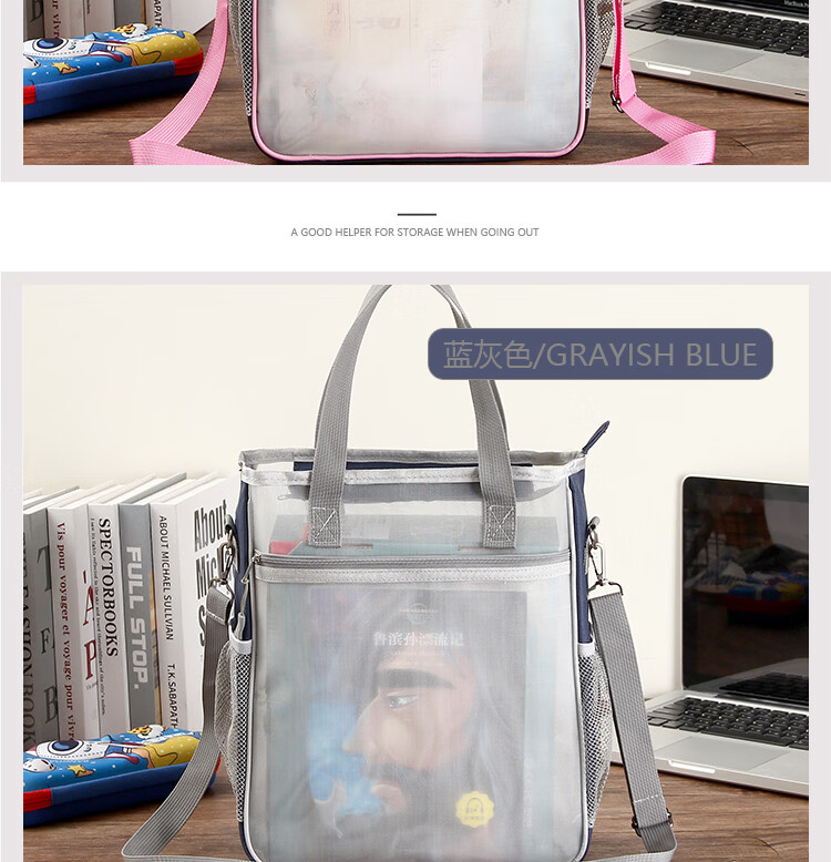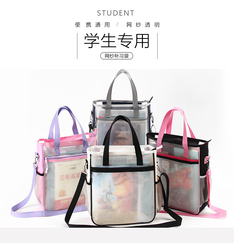巴布格网纱透明补习袋手提新款牛津布资料袋A4大容量学生课本补课拎书袋简约帆布拉链袋初中高美术收纳袋 蓝灰款【加厚网纱】学生收纳专用
