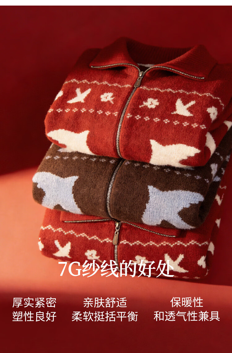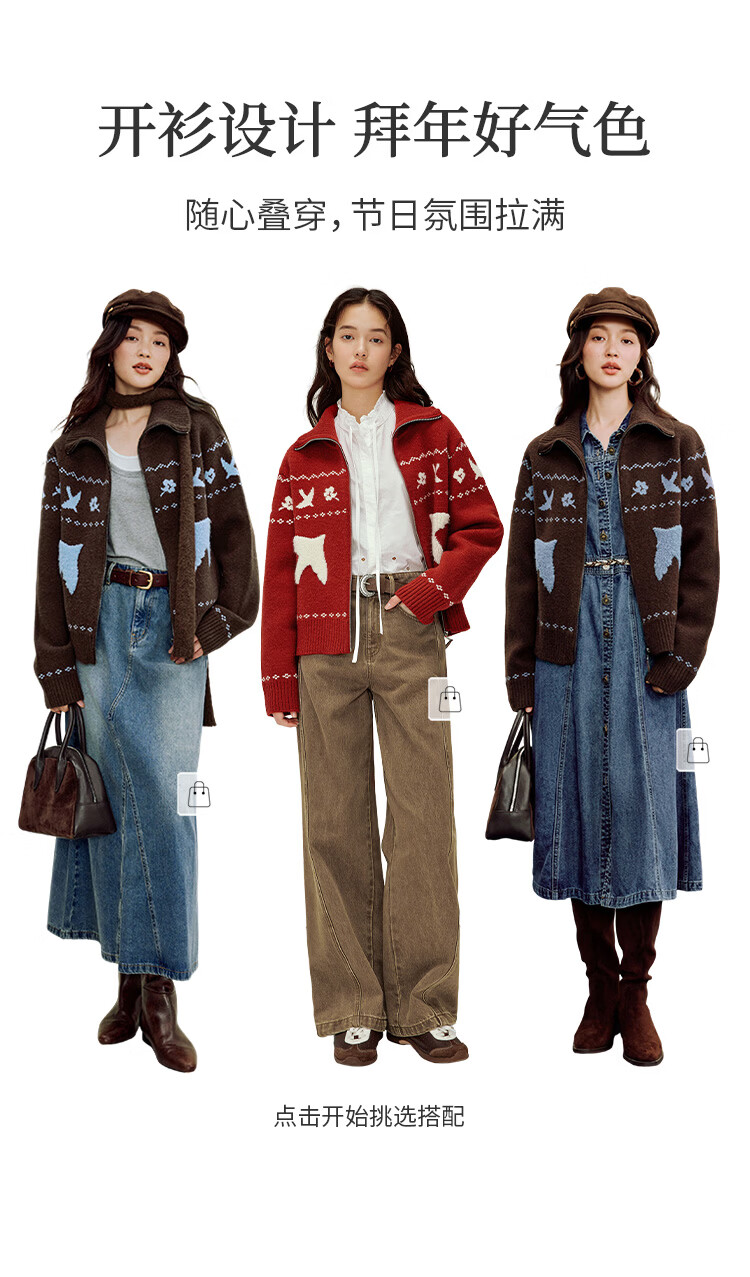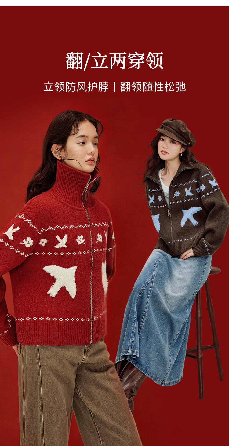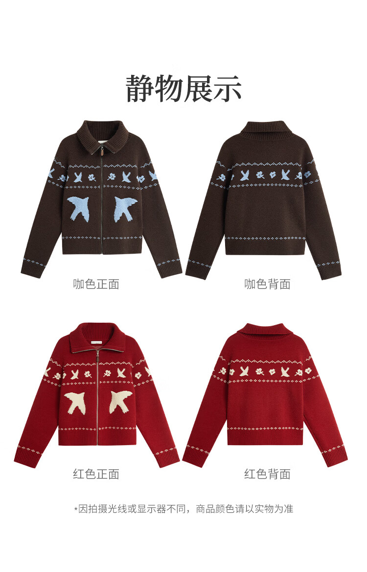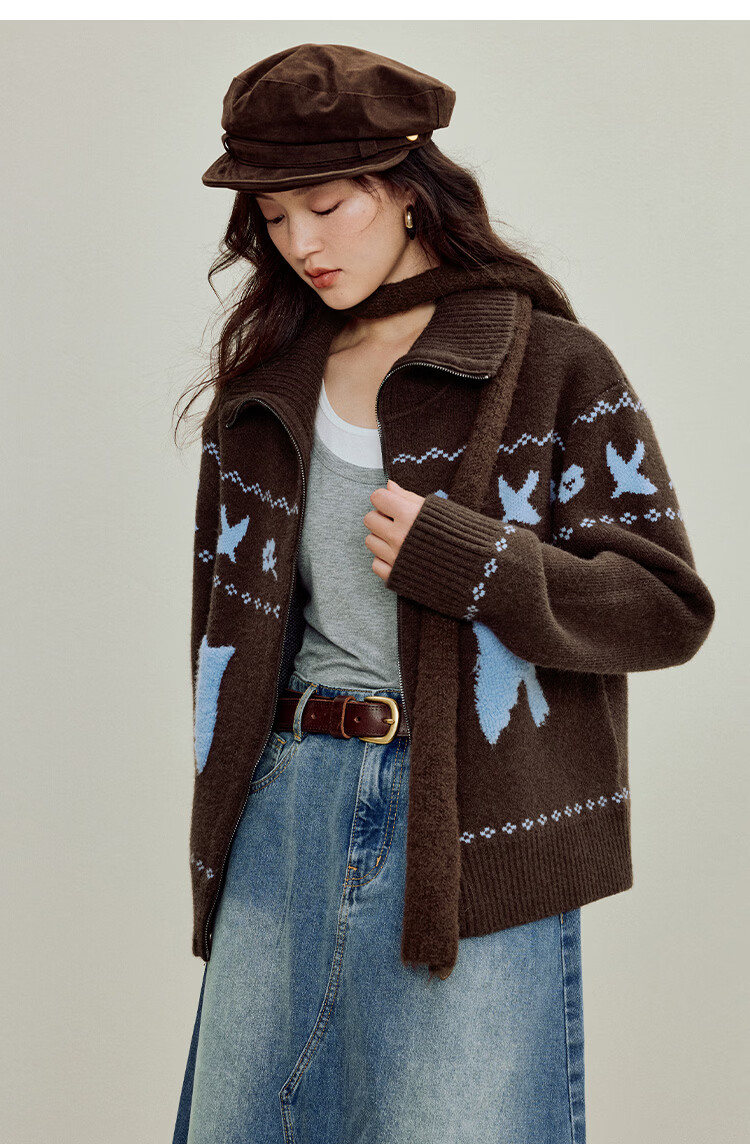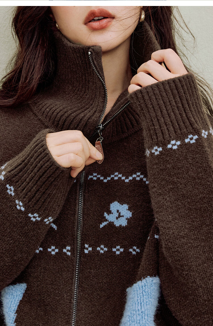 茵曼(INMAN)茵曼绒感提花翻领毛衣2025秋女装新款保暖针织开衫外套 咖色 M