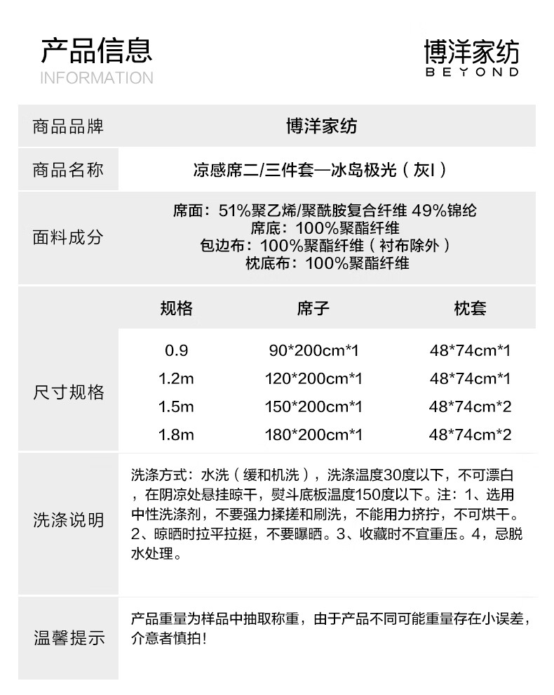 博洋(BEYOND)博洋家纺夏季凉感席二三件套家用可水洗可折叠单双人凉席夏天软席 【A类抑菌+可水洗】冰岛极光(灰) 两件套 90*200cm