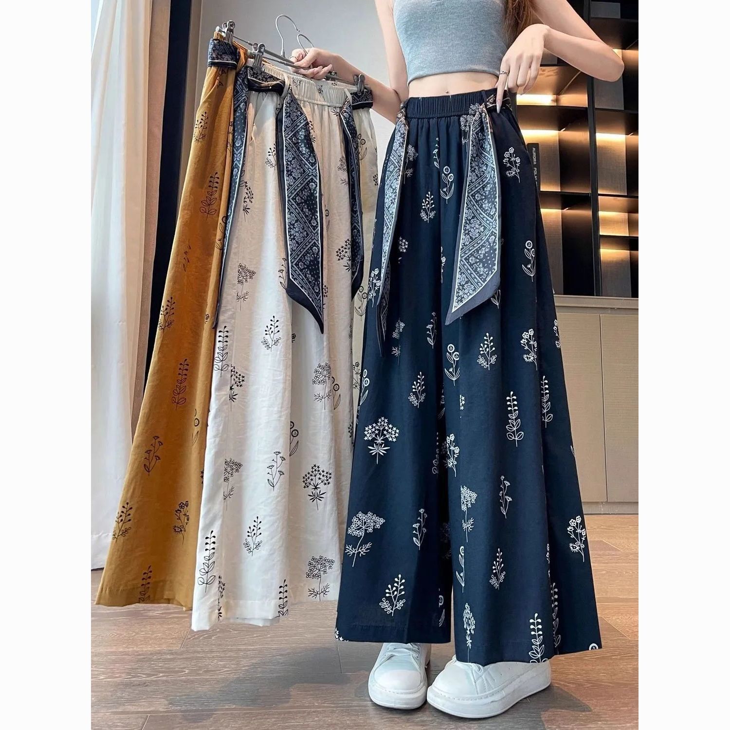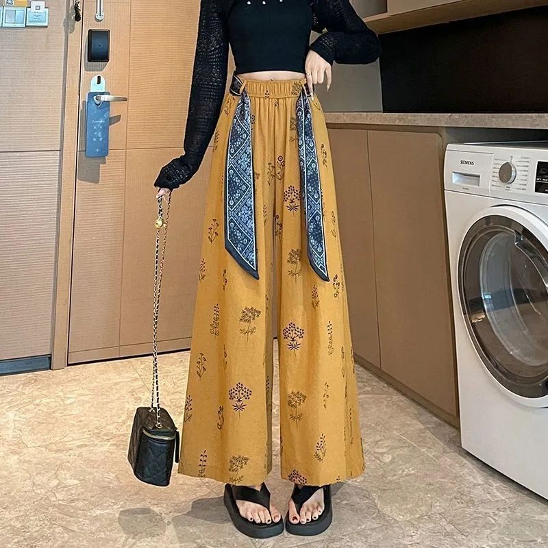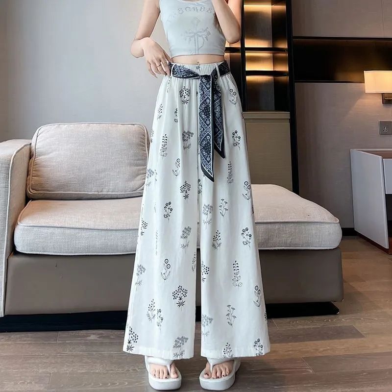 民族风宽松直筒休闲九分裤冰丝印花阔腿裤女夏季薄款新款高腰显瘦