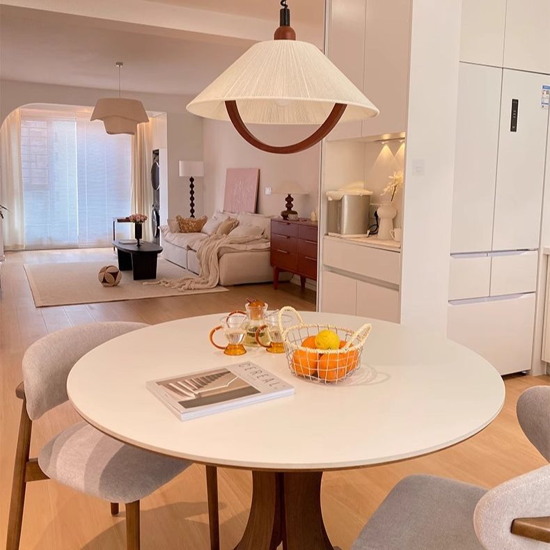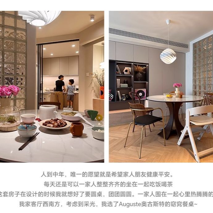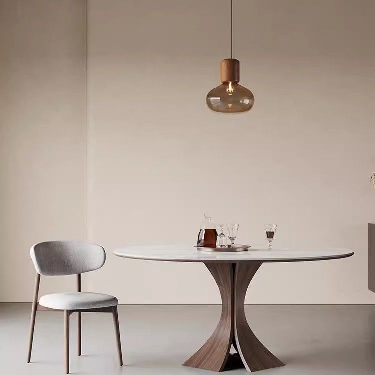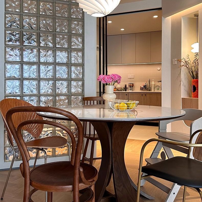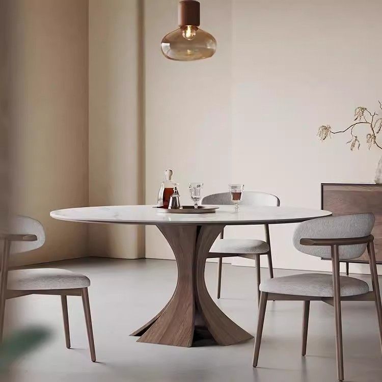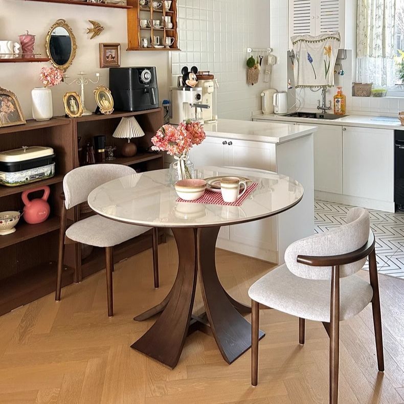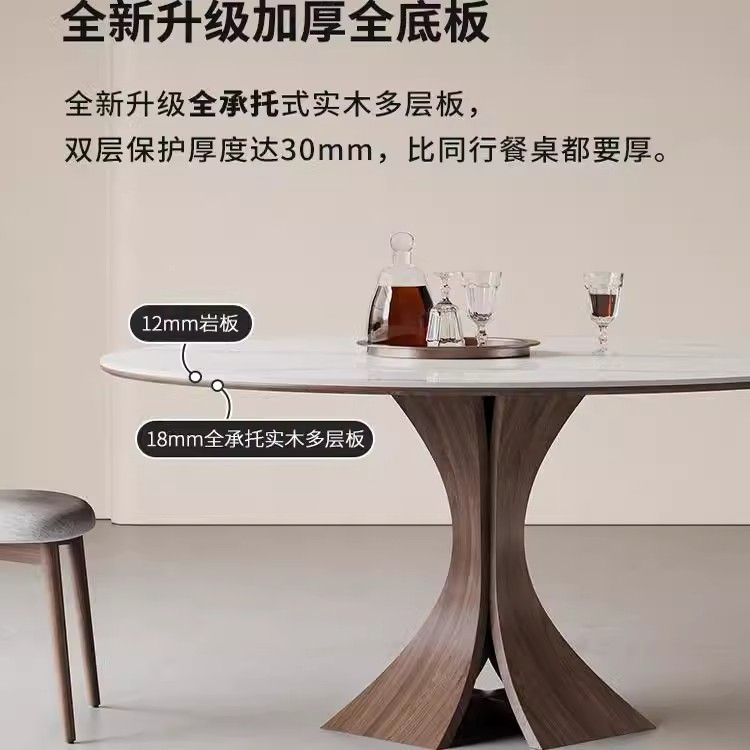 中古风意式亮光岩板餐桌带转盘家用现代简约实木胡桃色圆形餐桌