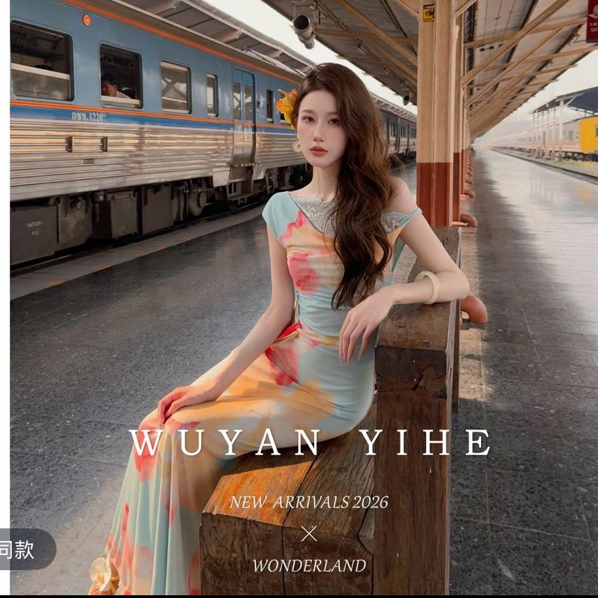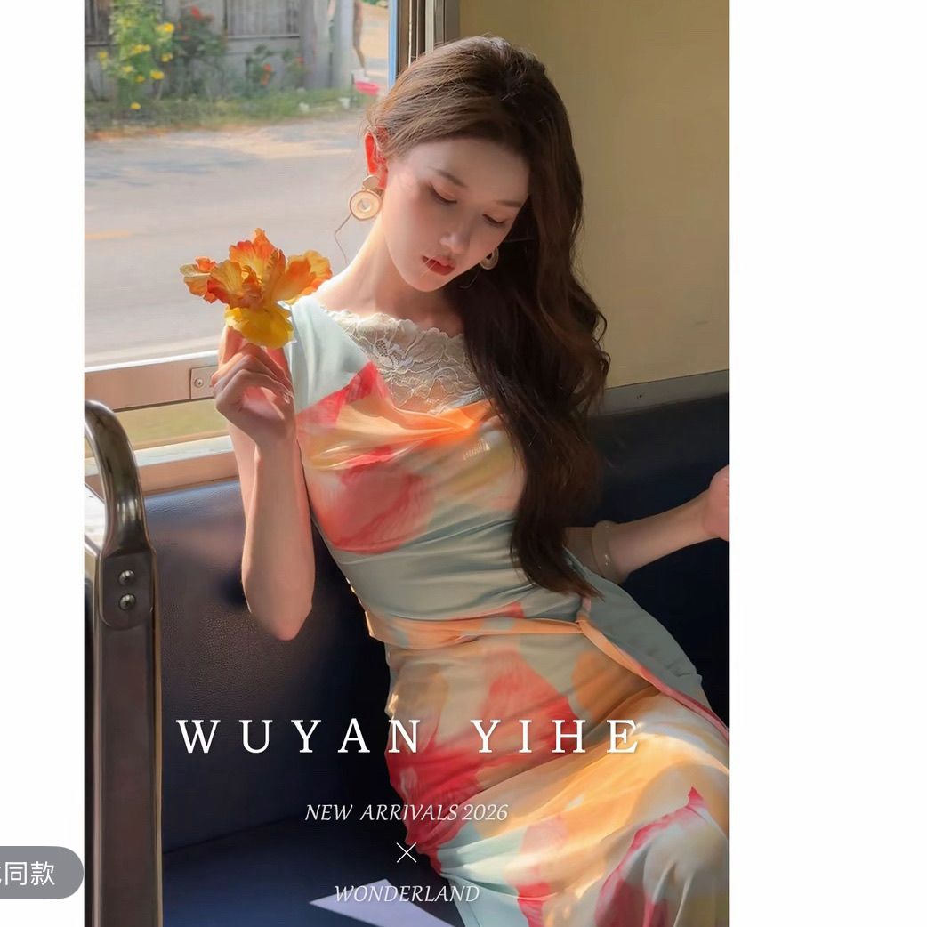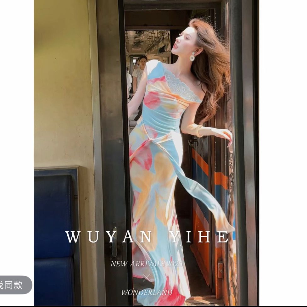 无艳一禾【虞娇】原创设计感晕染印花斜肩蕾丝收腰连衣裙鱼尾长裙【15天内发货】