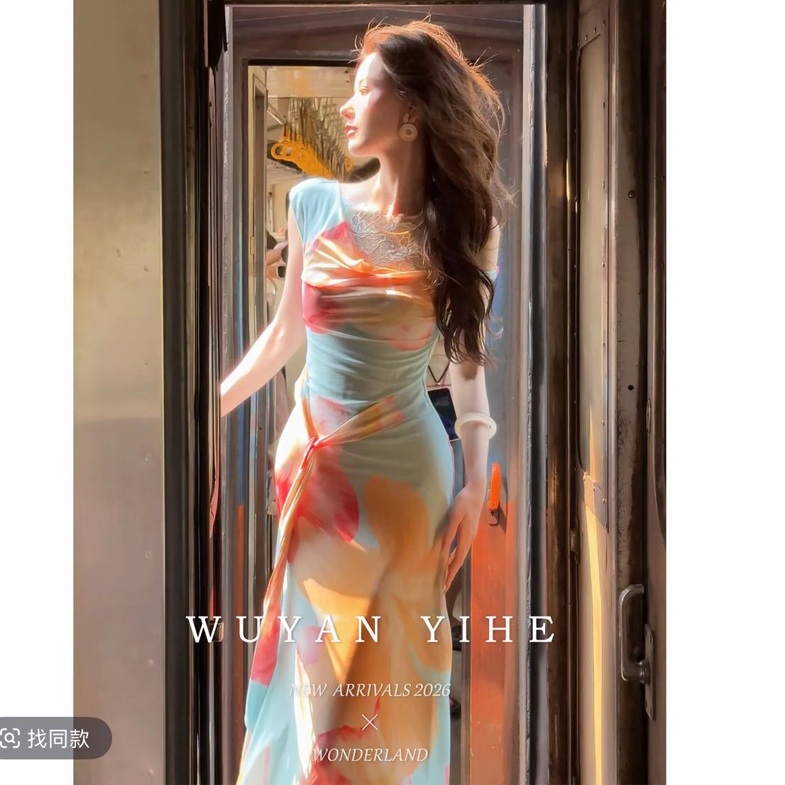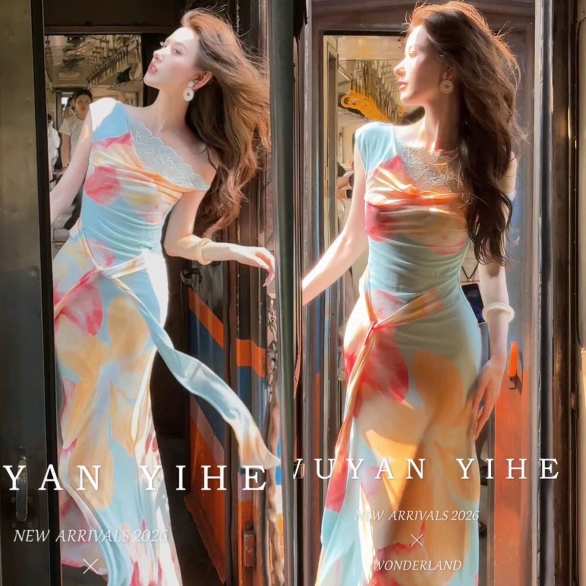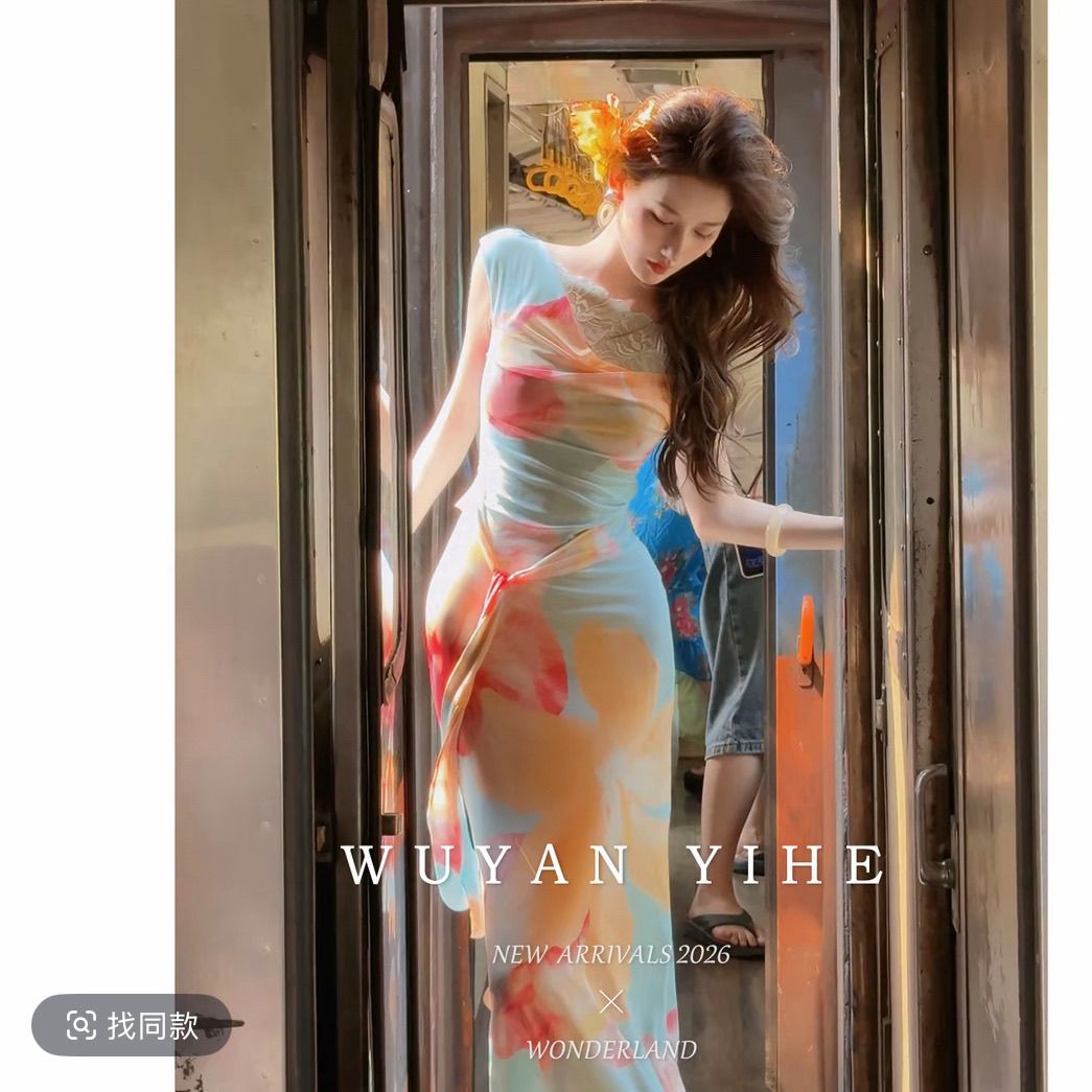 无艳一禾【虞娇】原创设计感晕染印花斜肩蕾丝收腰连衣裙鱼尾长裙【15天内发货】