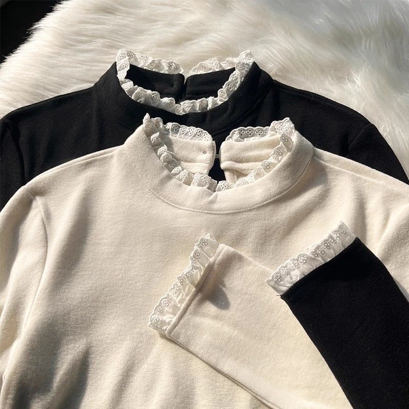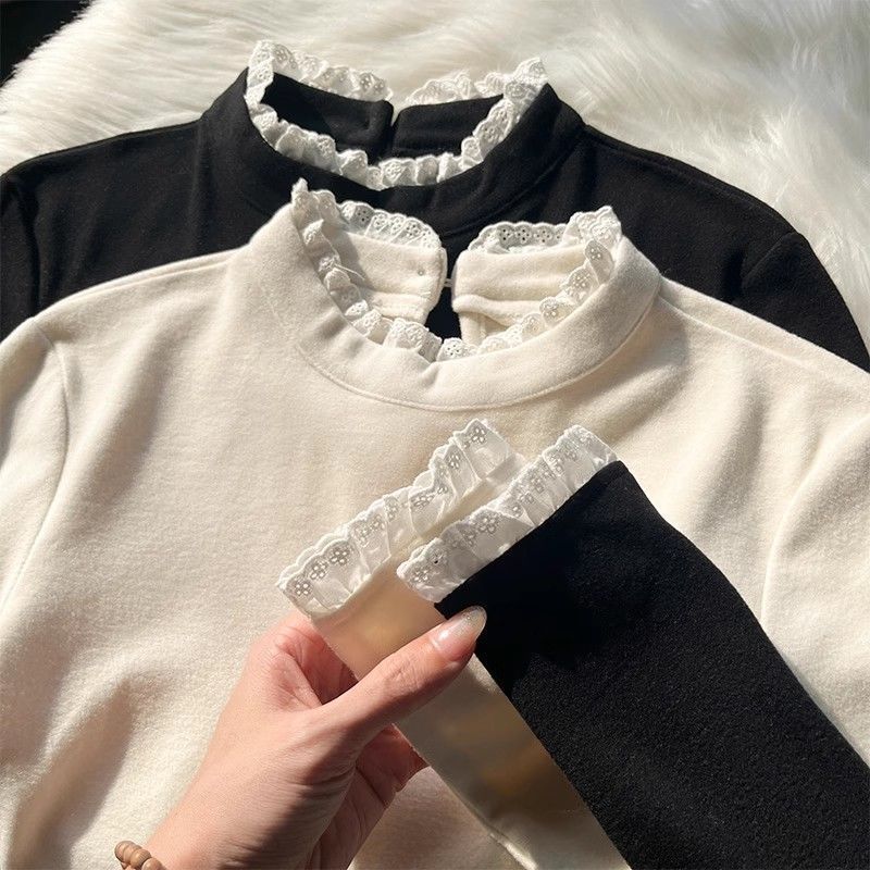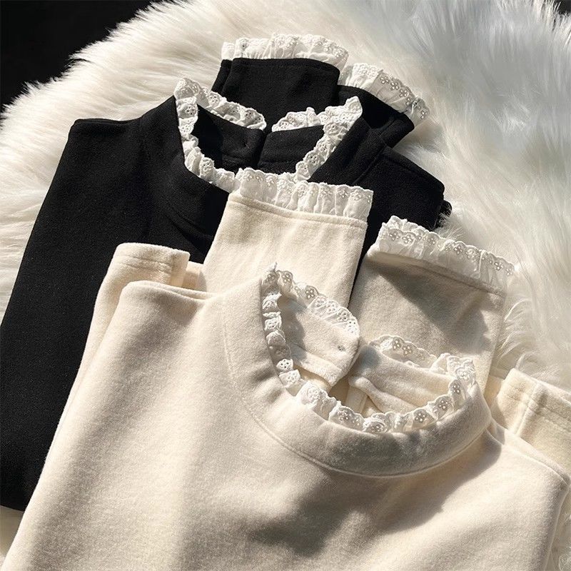 半高领德绒加厚长袖T恤打底衫女2025秋冬季蕾丝花边内搭修身上衣