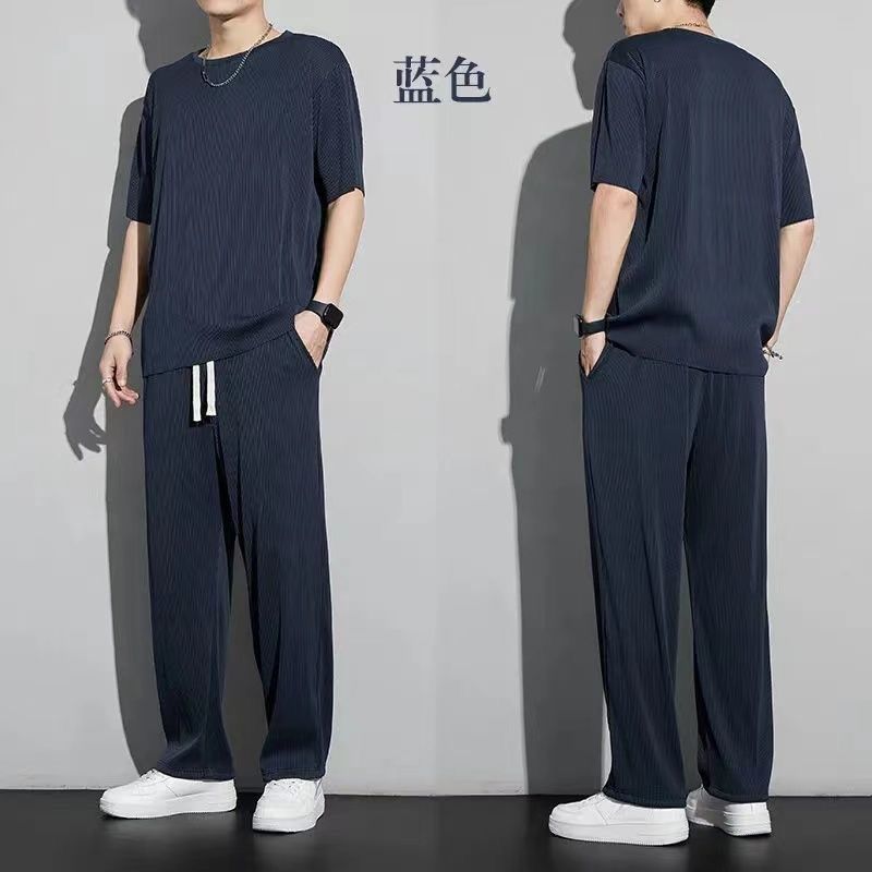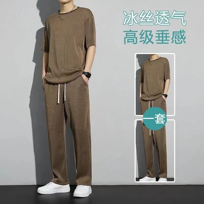 冰丝运动套装男士夏季薄款休闲长裤子短袖t恤ins速干垂感衣服一套