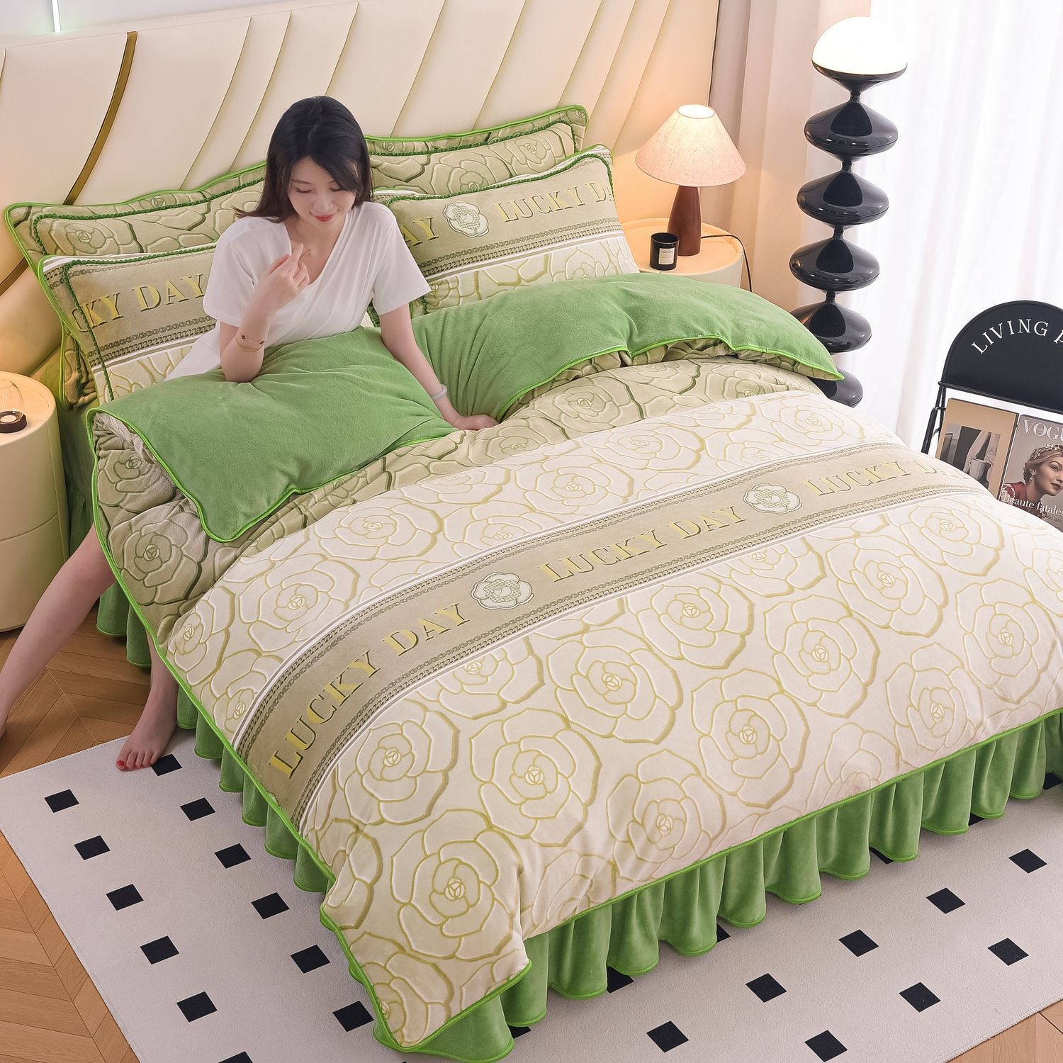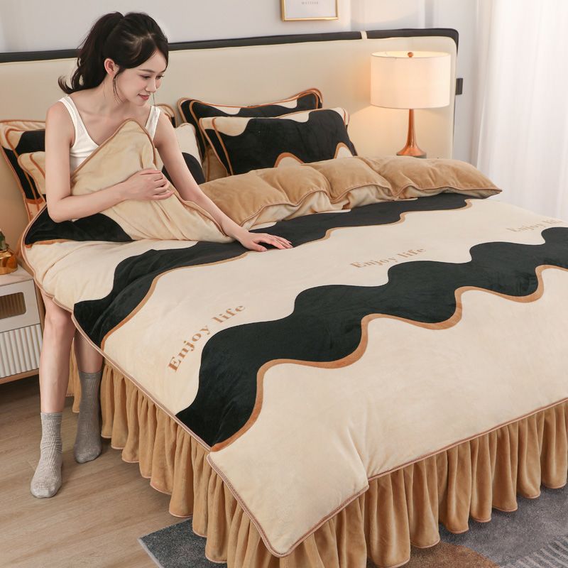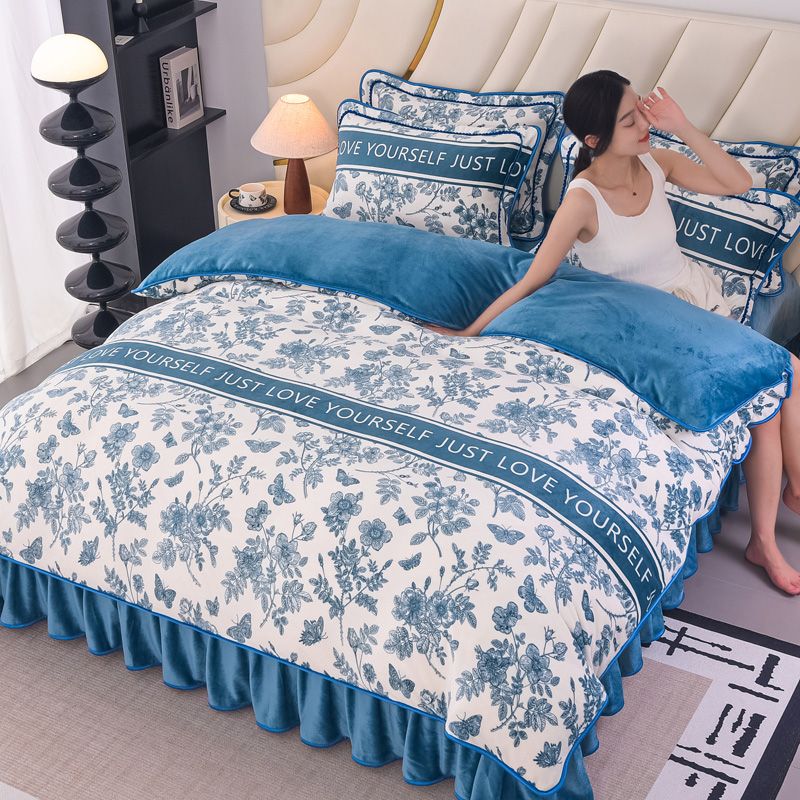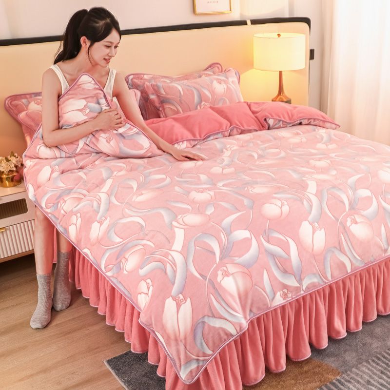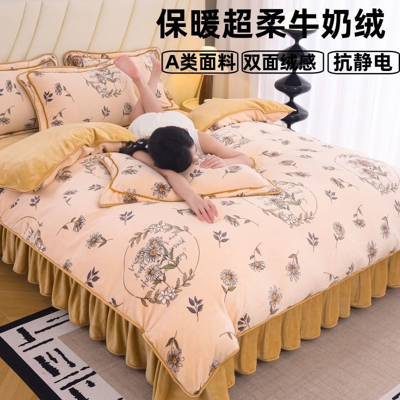 冬季加厚牛奶绒四件套保暖被套9斤双面加绒床裙款床上用品