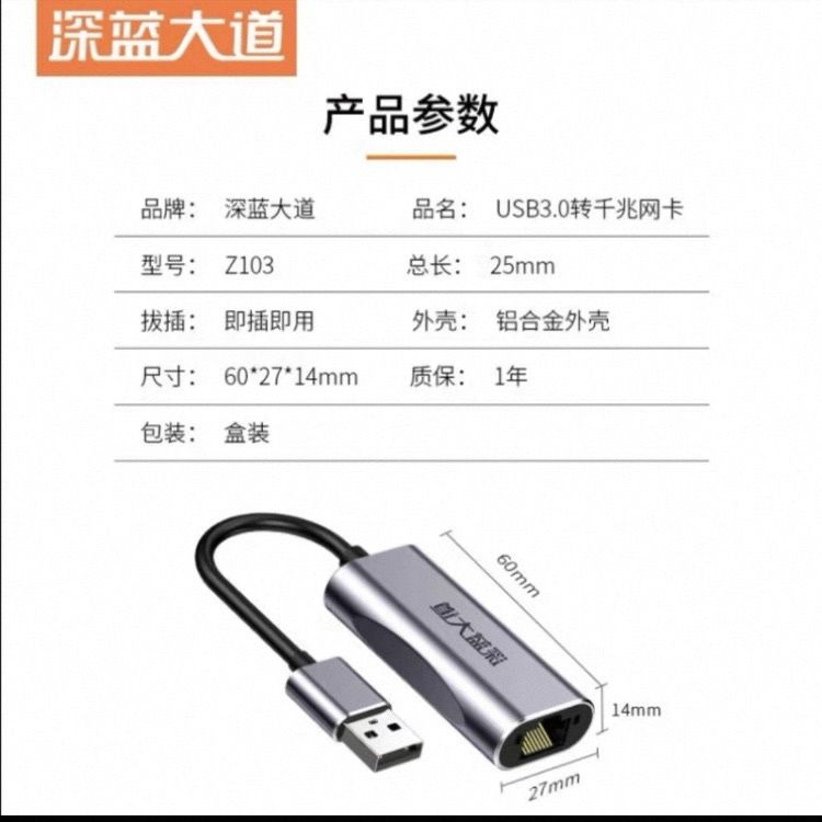 深蓝大道外置USB3.0 千兆网卡智能免驱 即插即用 全系统兼容usb
